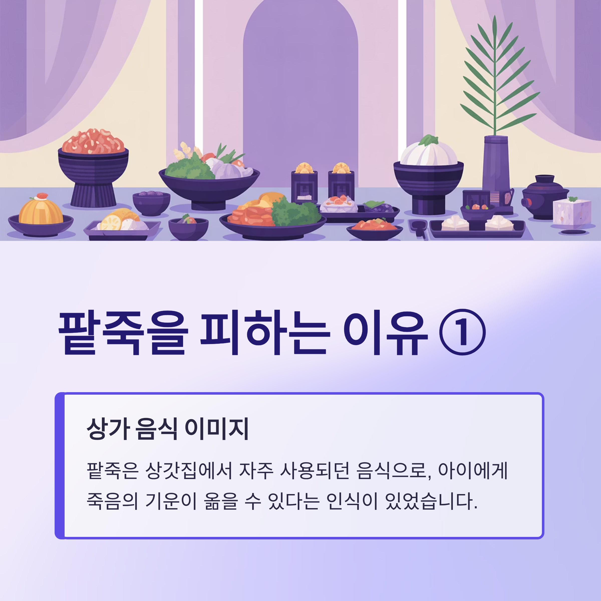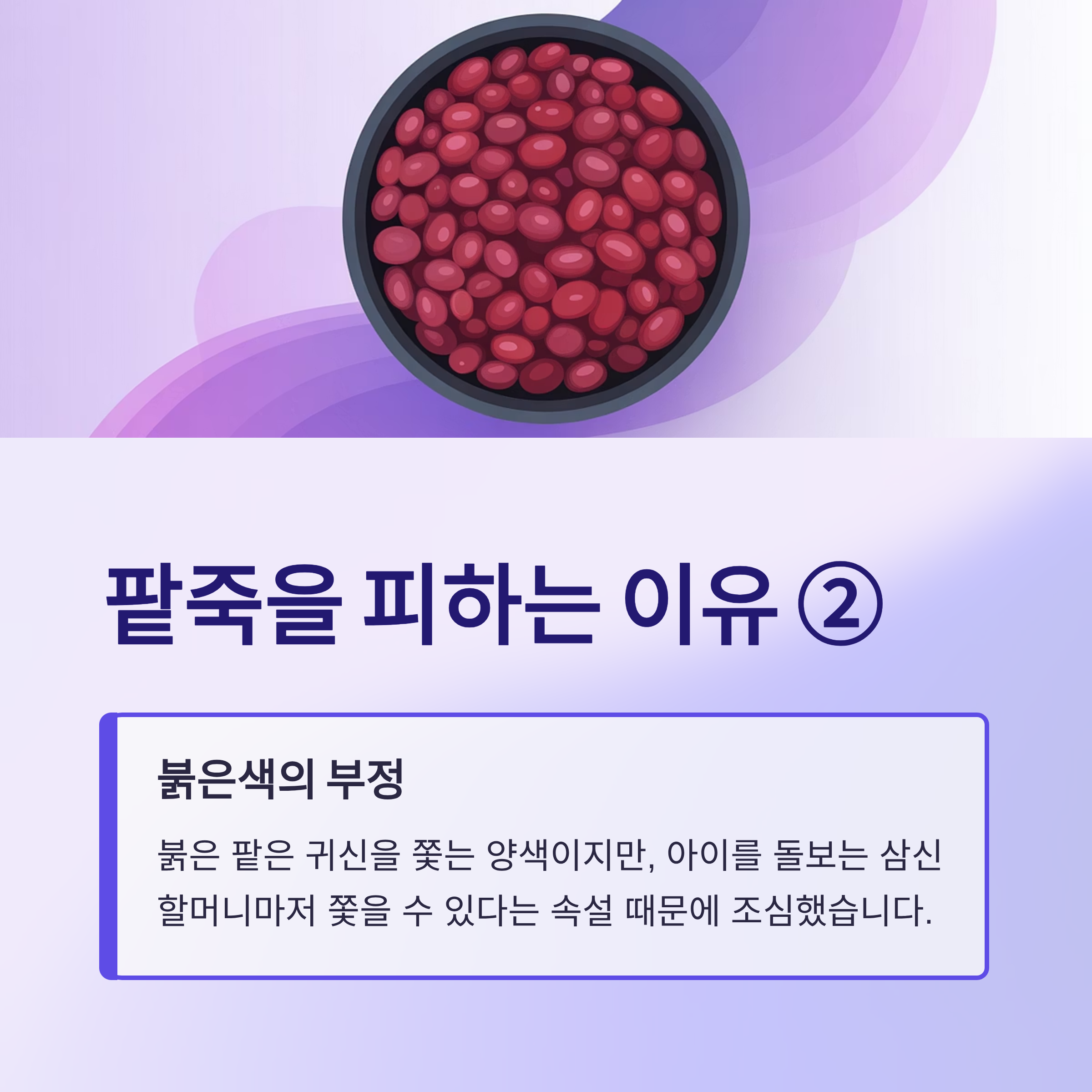 팥죽은 상갓집에서 자주 사용되던 음식으로, 아이에게 죽음의 기운이 옮을 수 있다는 인식이 있었습니다.