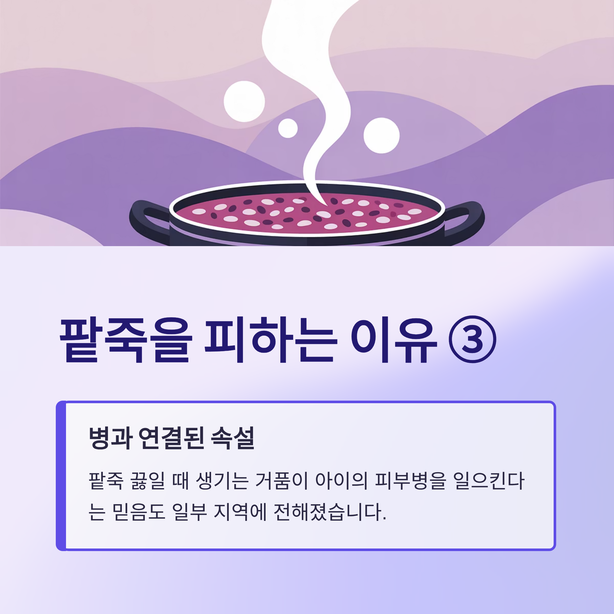 팥죽 끓일 때 생기는 거품이 아이의 피부병을 일으킨다는 믿음도 일부 지역에 전해졌습니다.