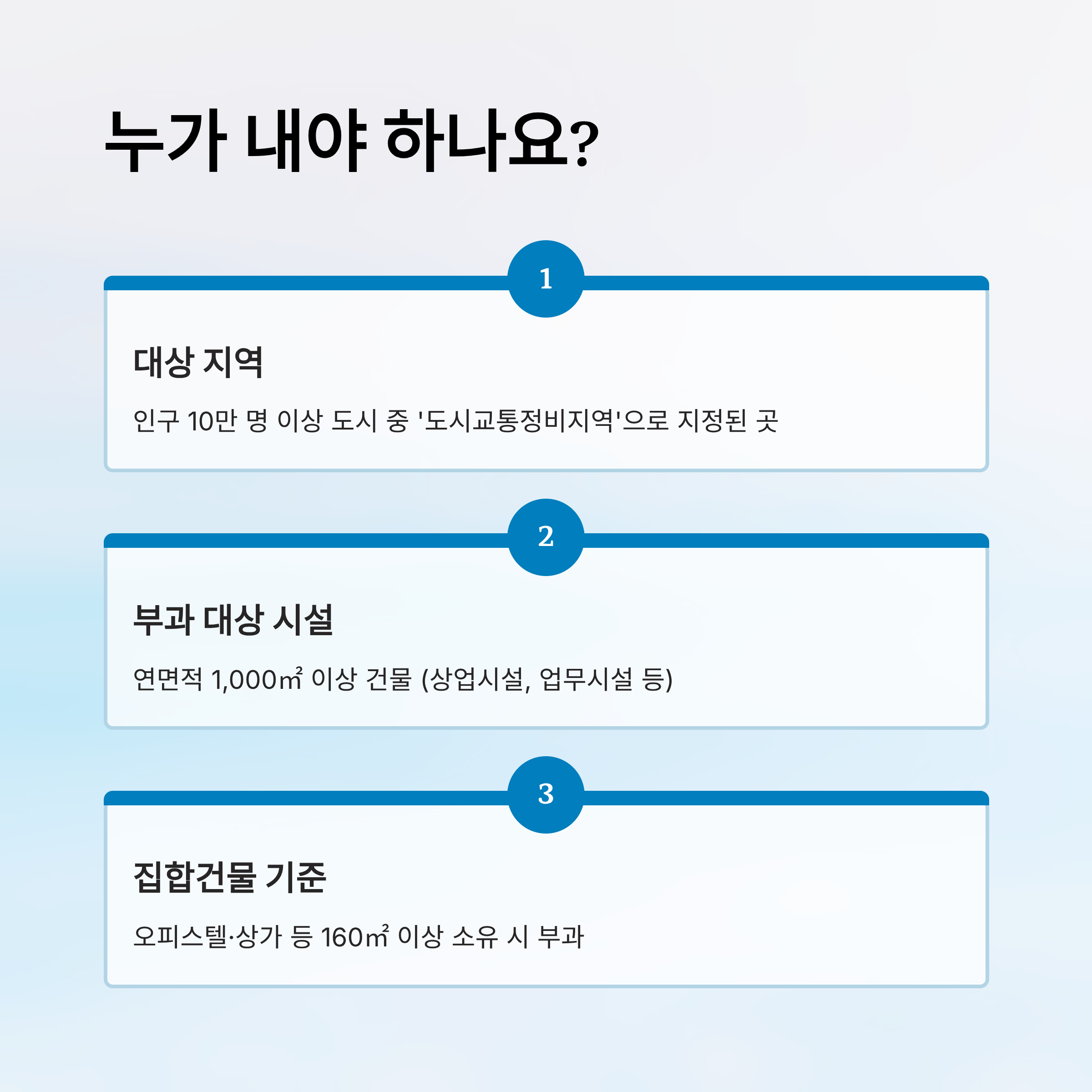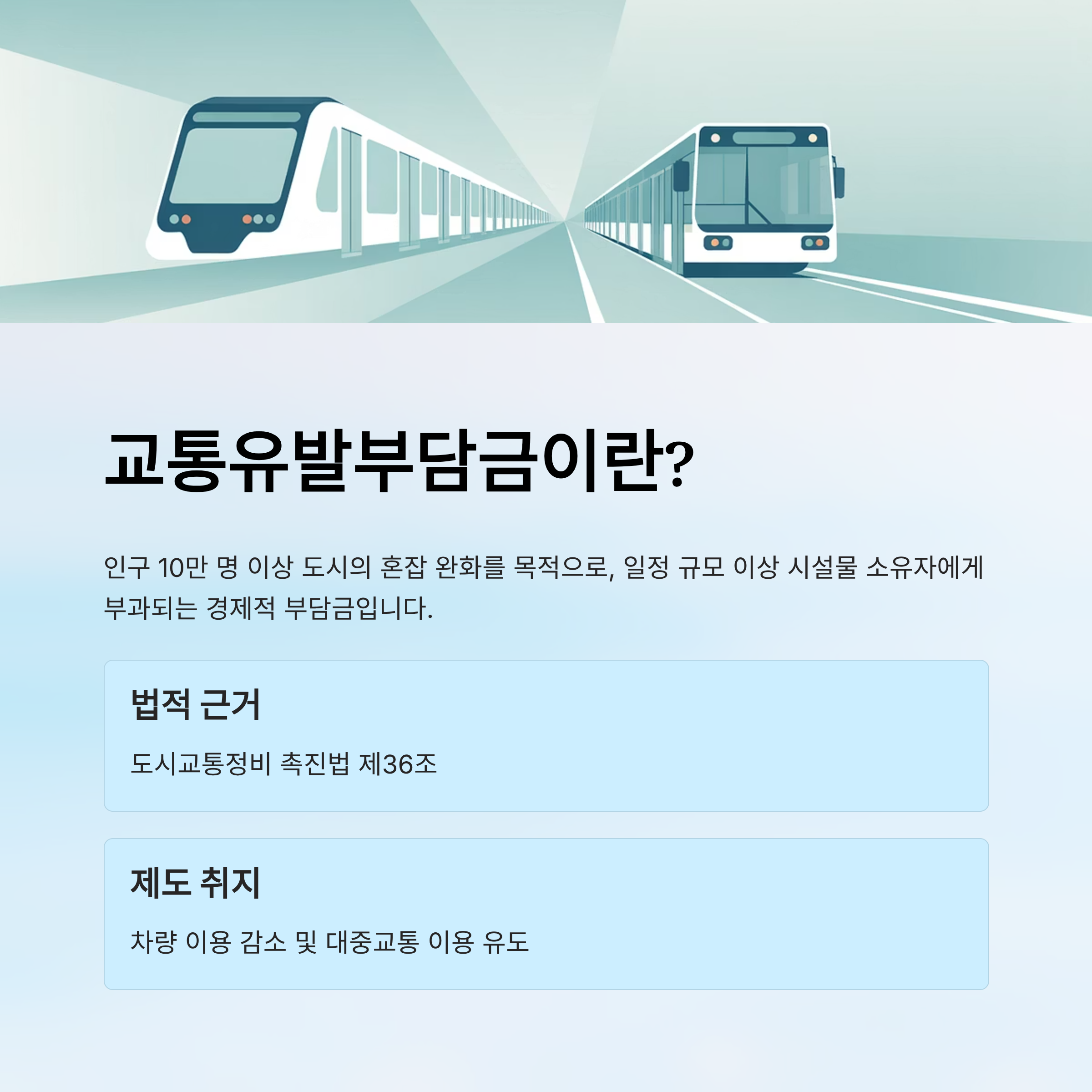 교통유발부담금은 인구 10만 명 이상 도시의 혼잡 완화를 목적으로, 일정 규모 이상의 시설물 소유자에게 부과되는 경제적 부담금입니다.