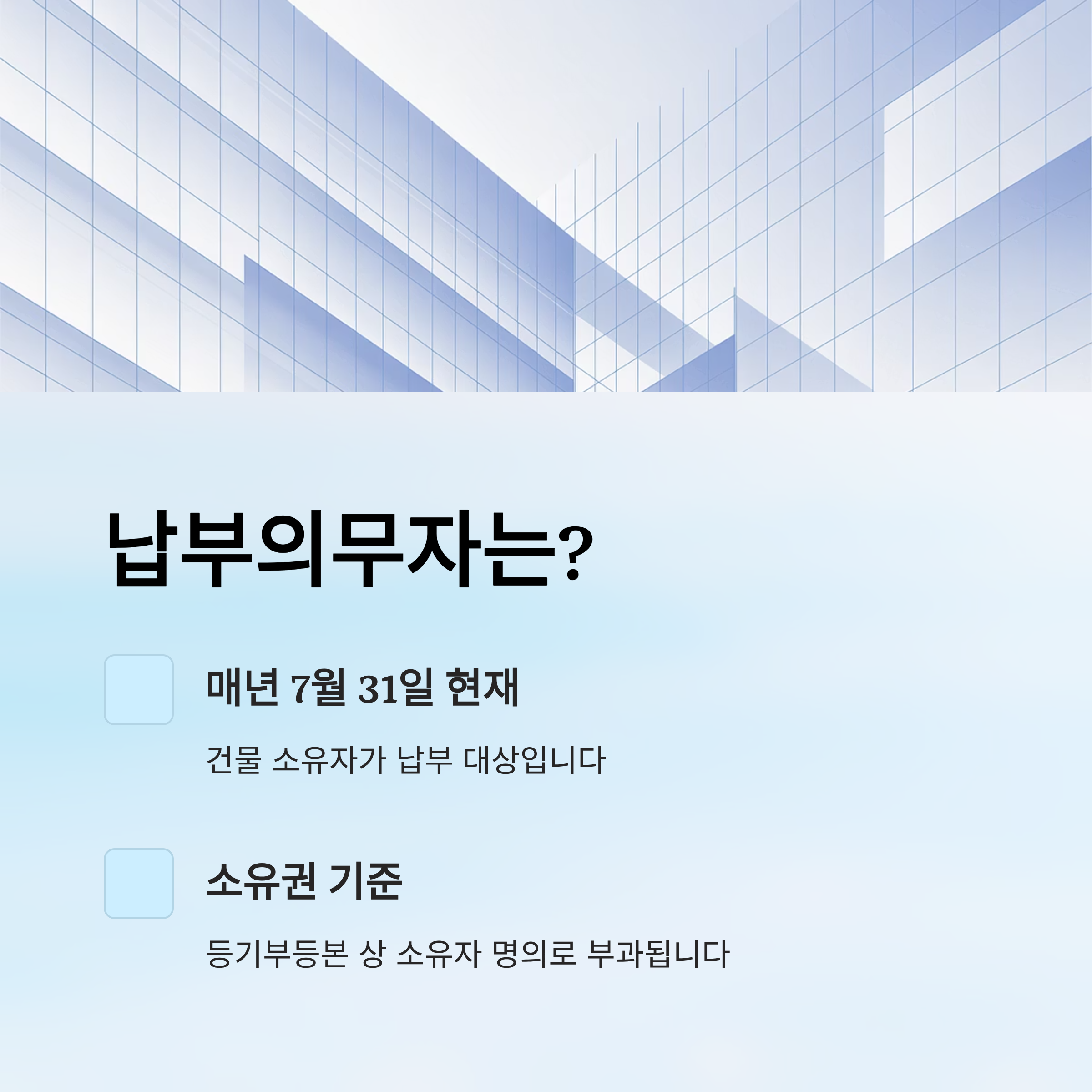 - 매년 7월 31일 현재 건물 소유자가 납부 대상입니다.