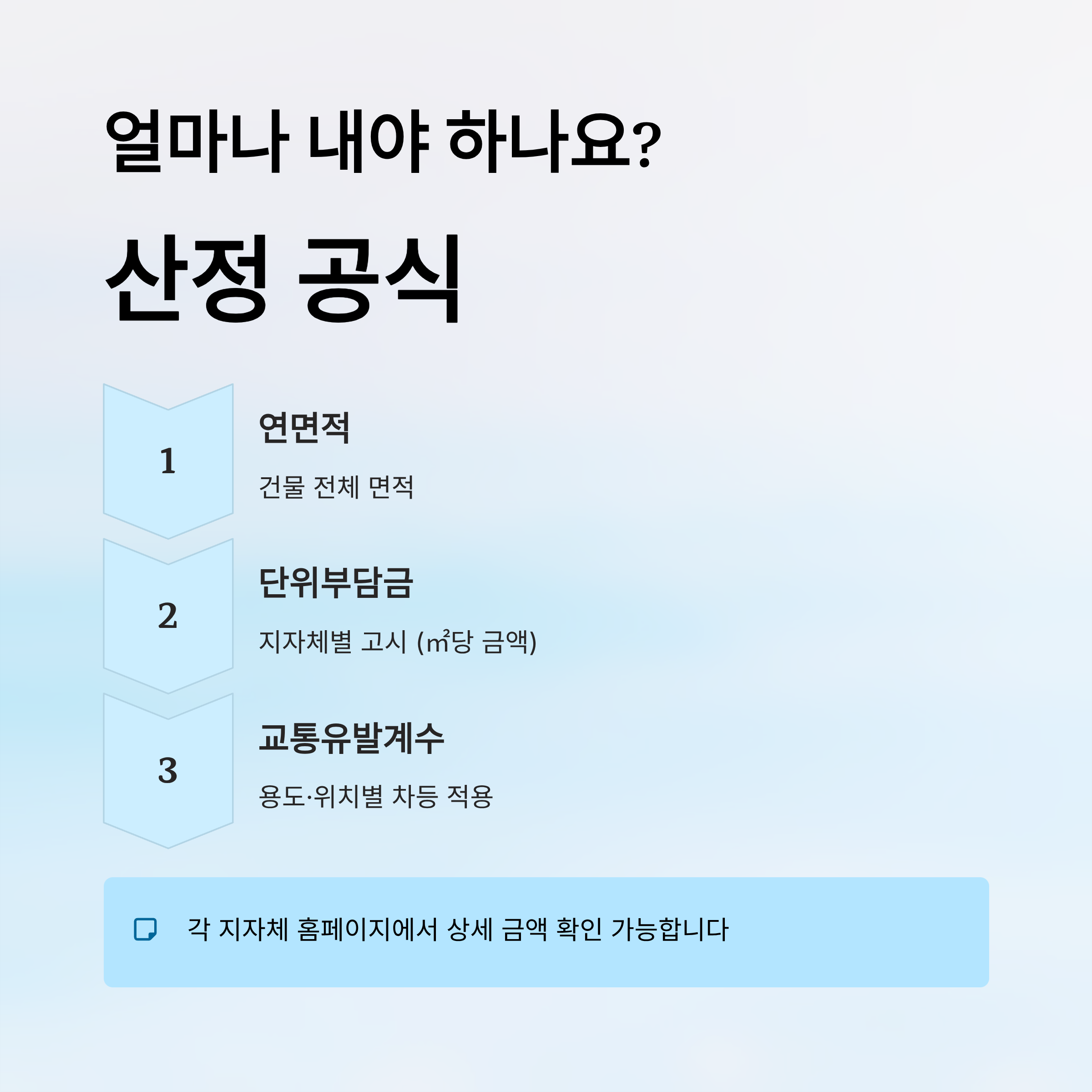 - 단위부담금: 지자체별로 고시 (㎡당 금액)