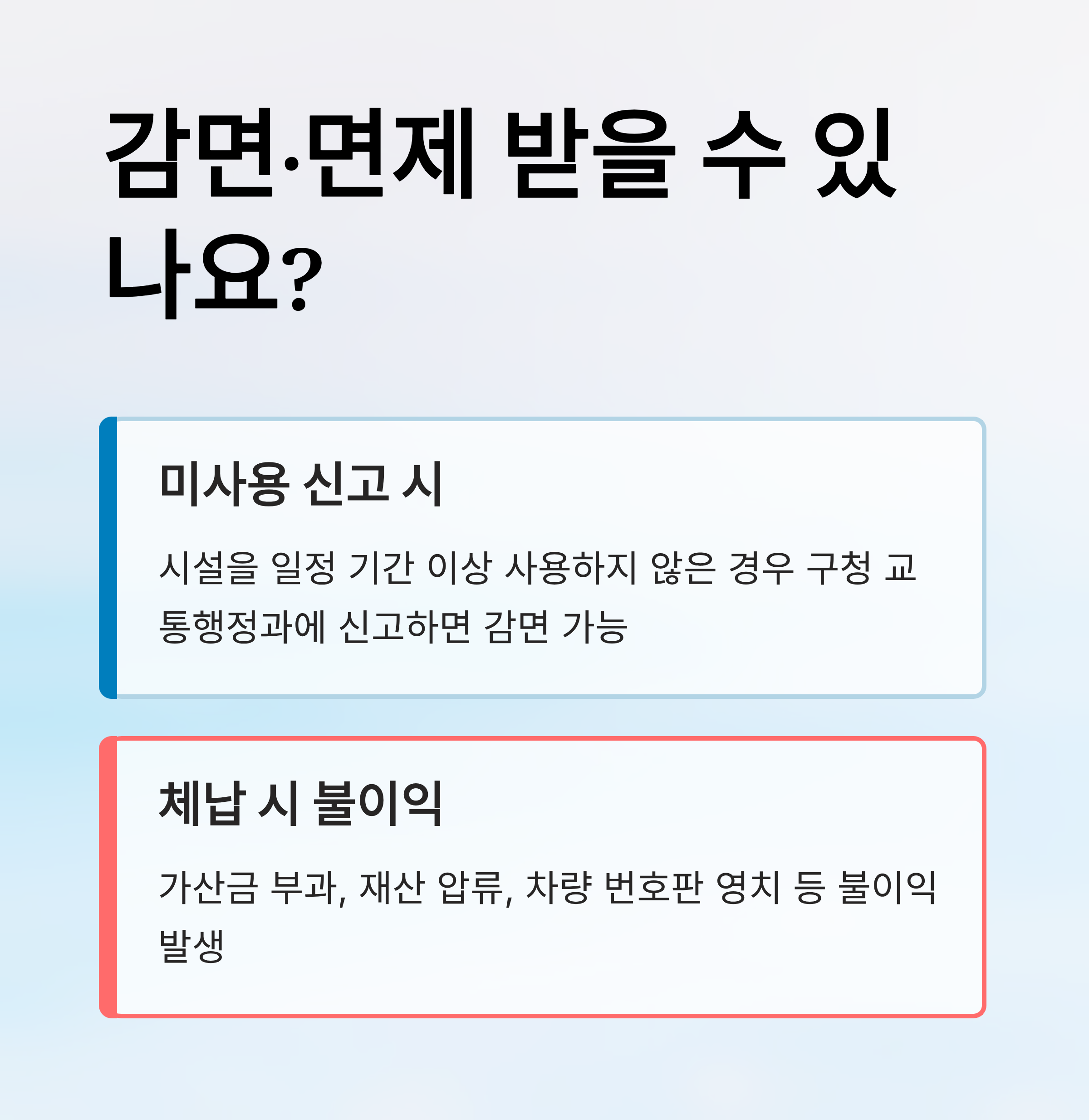 - 시설을 일정 기간 이상 사용하지 않은 경우 구청 교통행정과에 미사용 신고 시 감면 가능