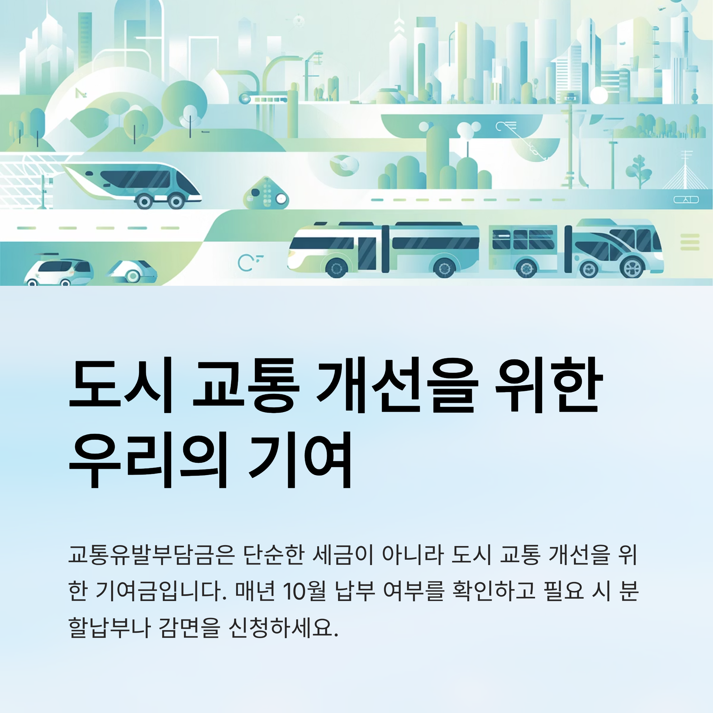 교통유발부담금은 단순한 세금이 아니라, 도시 교통 개선을 위한 기여금입니다. 매년 10월이면 부과 대상자라면 반드시 납부 여부를 확인하고, 필요 시 분할납부나 감면 신청을 준비해야 합니다.