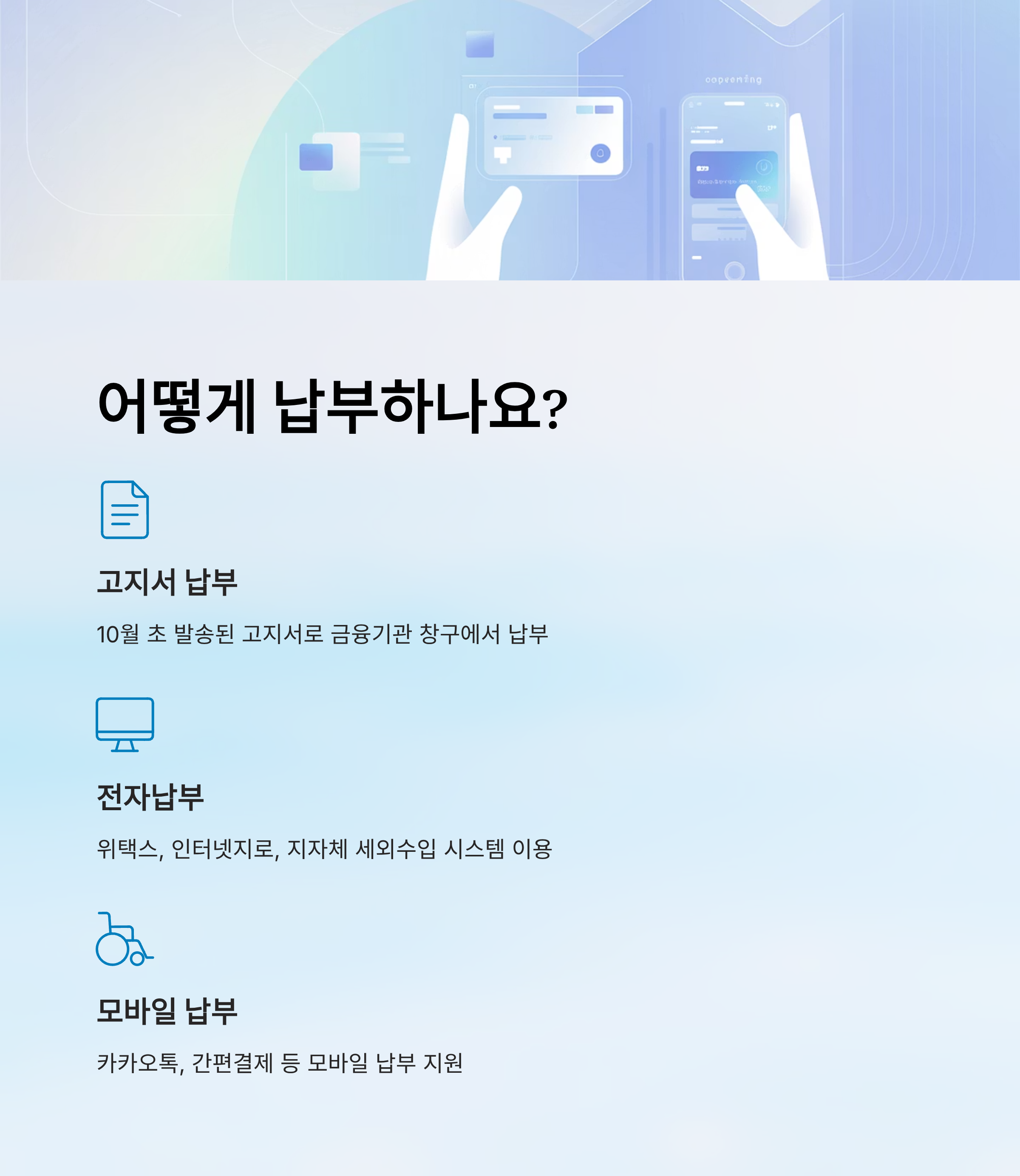- 10월 초, 지자체에서 발송된 고지서를 지참하여 금융기관 창구 납부