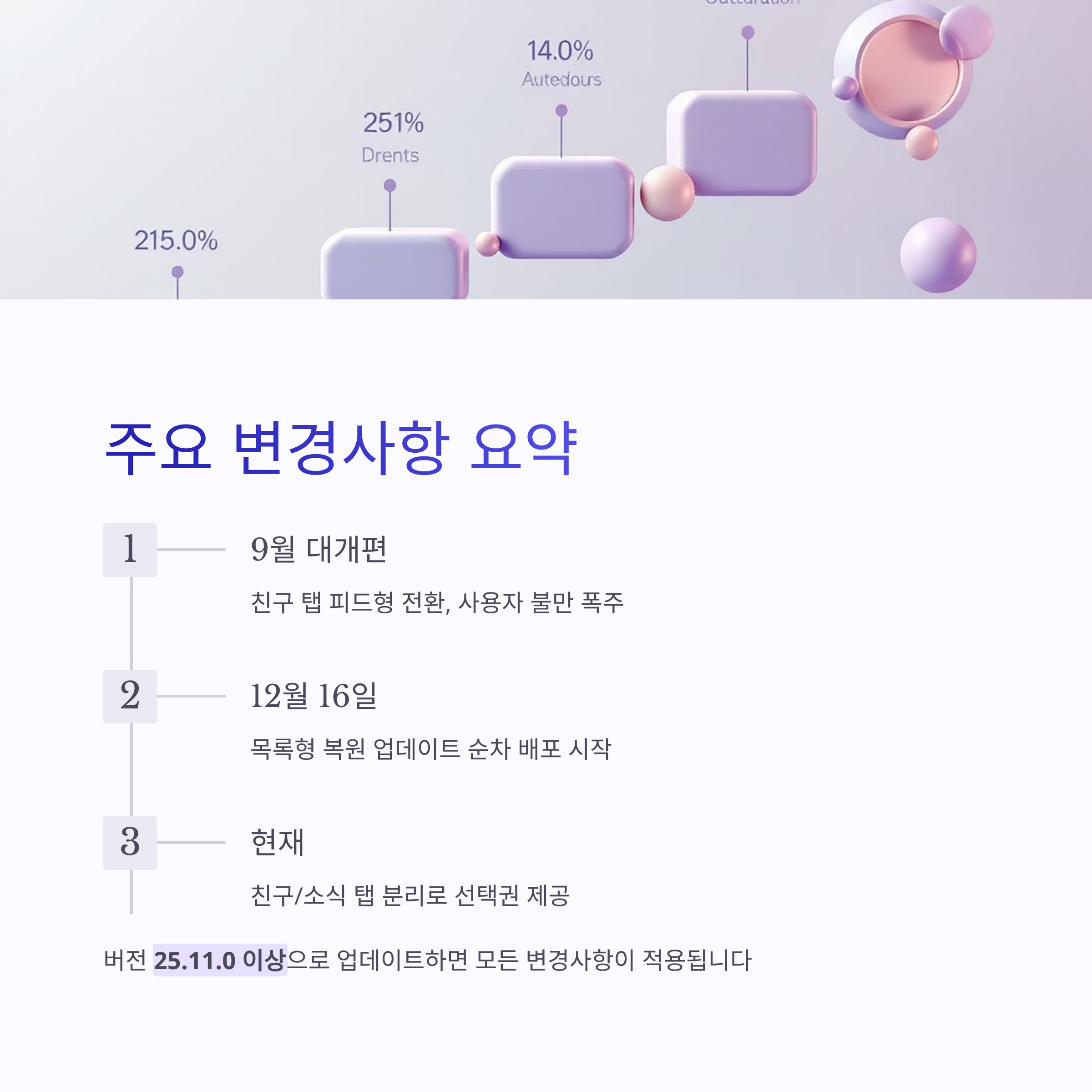 2025년 12월 "카카오"의 메신저 카카오톡 12월 업데이트가 순차 배포되고 있습니다. 이번 업데이트의 핵심은 이용자 불만이 컸던 친구 탭 피드형 UI를 목록형으로 되돌린 것입니다. 업데이트 시점, 적용 방법, 변경 내용, 업데이트가 안 뜰 때 해결법까지 한 번에 정리했습니다.
