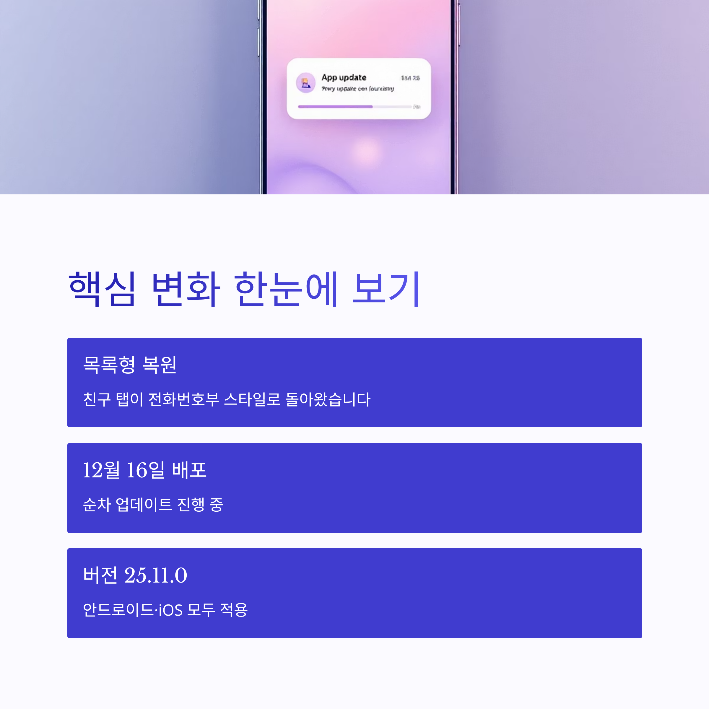 - 핵심 변화: 친구 탭 목록형(전화번호부 스타일) 복원
