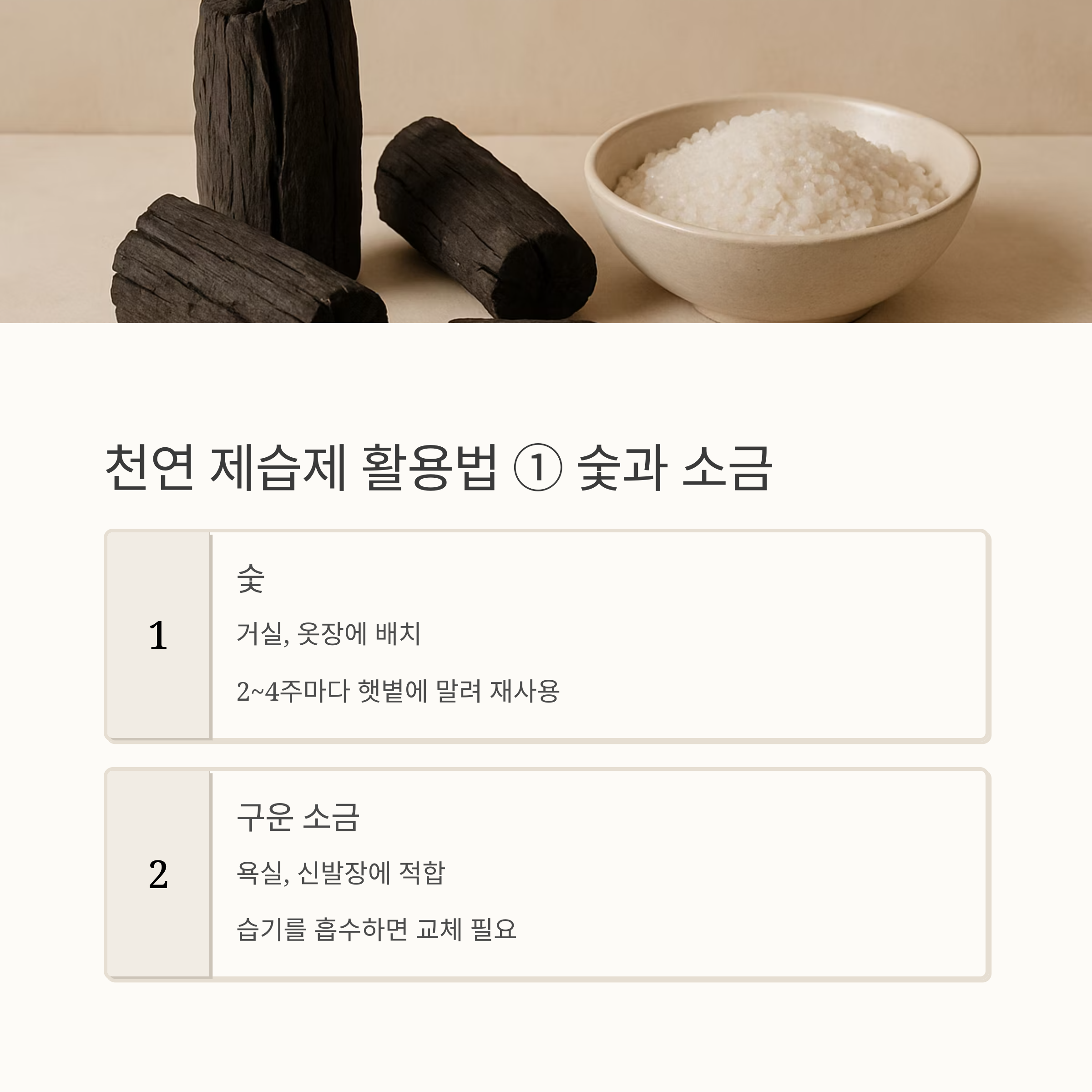 | 구운 소금 | 욕실, 신발장 | 습기 먹으면 교체 |