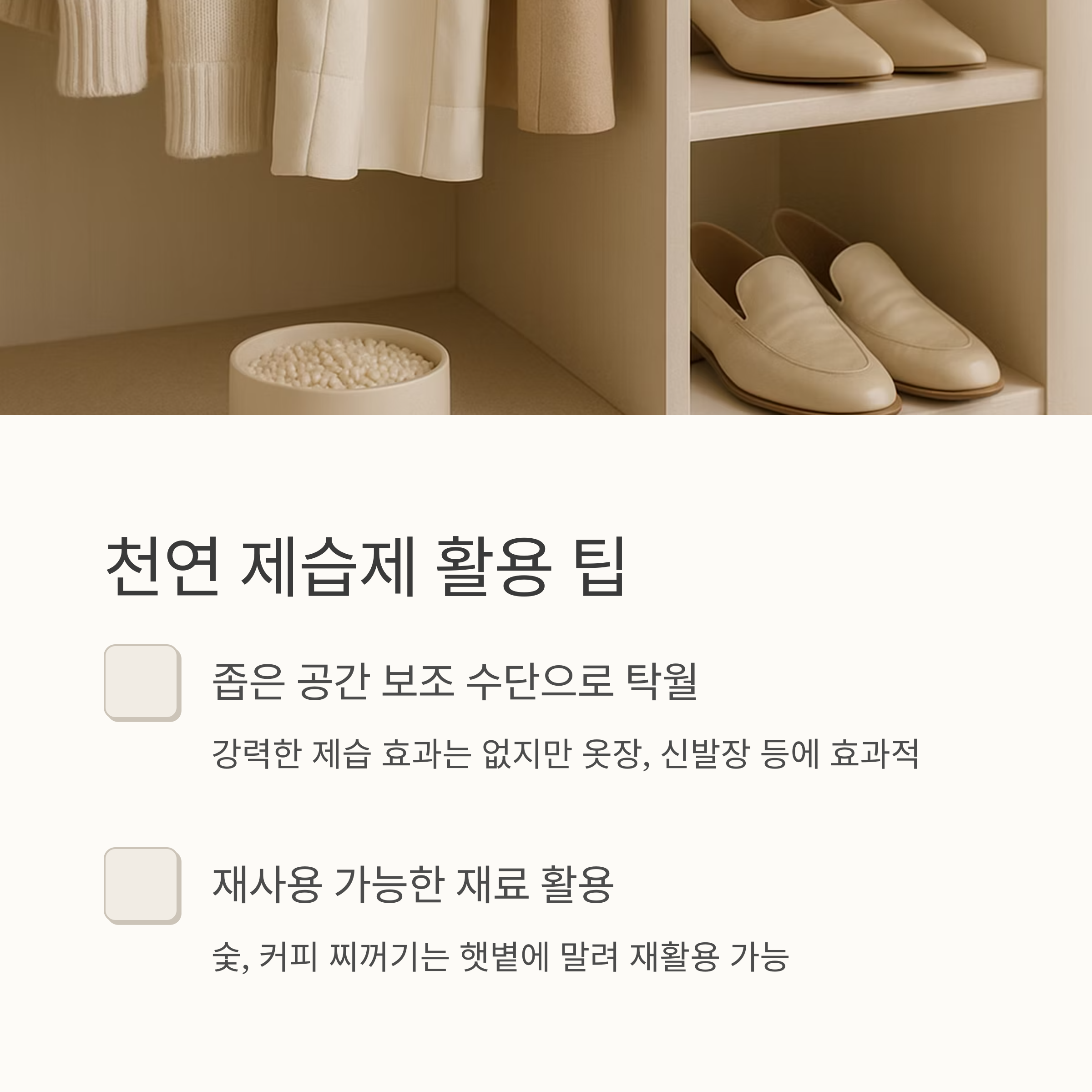 - 천연 제습제는 강력한 제습기는 아니지만, 좁은 공간 보조 수단으로 탁월