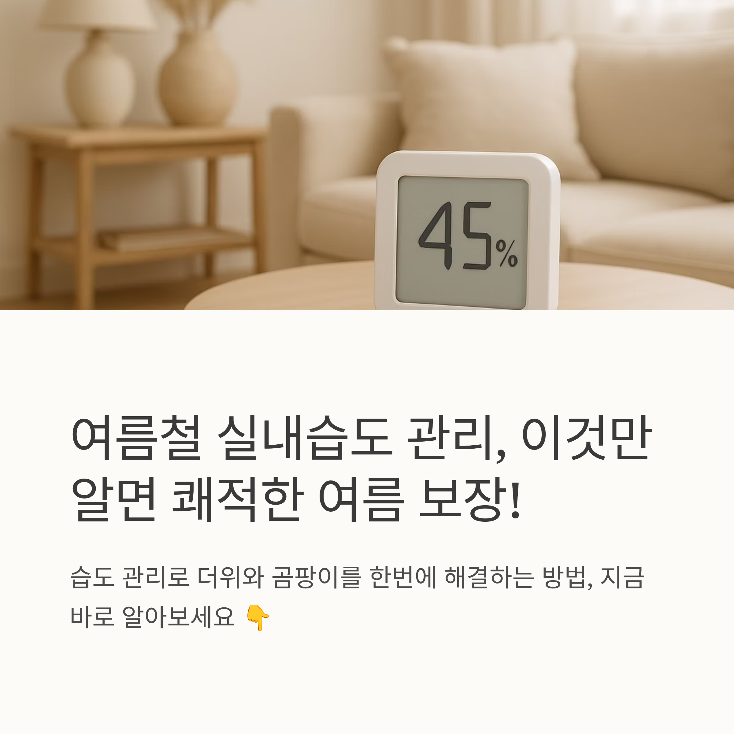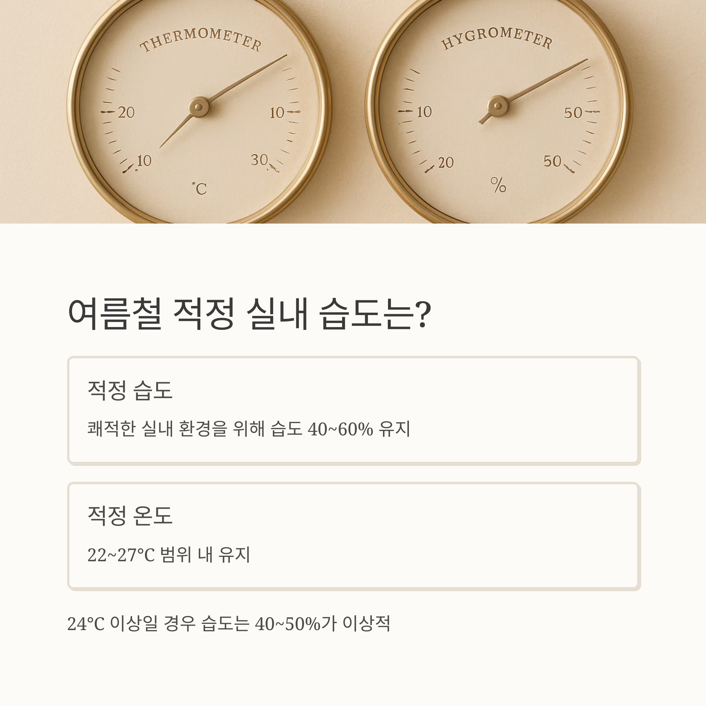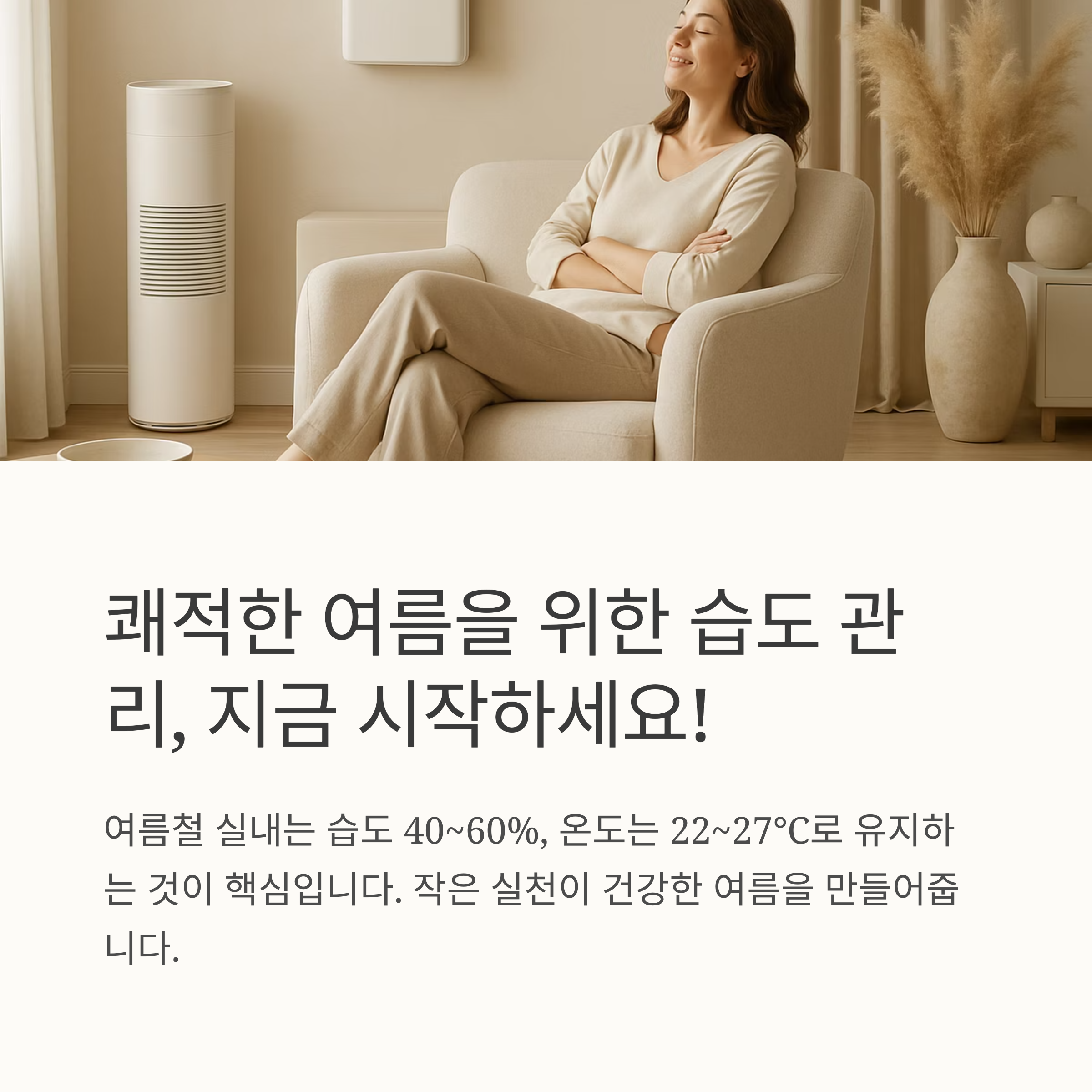 여름철 실내는 습도 40~60%, 온도는 22~27℃로 유지하는 것이 쾌적한 생활의 핵심입니다.