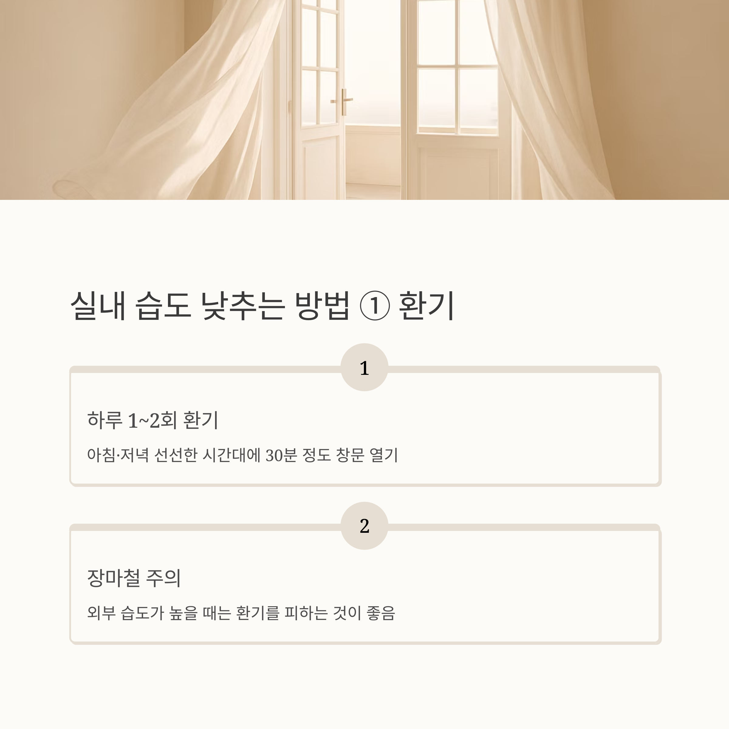 - 하루 1~2회, 아침·저녁 선선한 시간대에 30분 환기