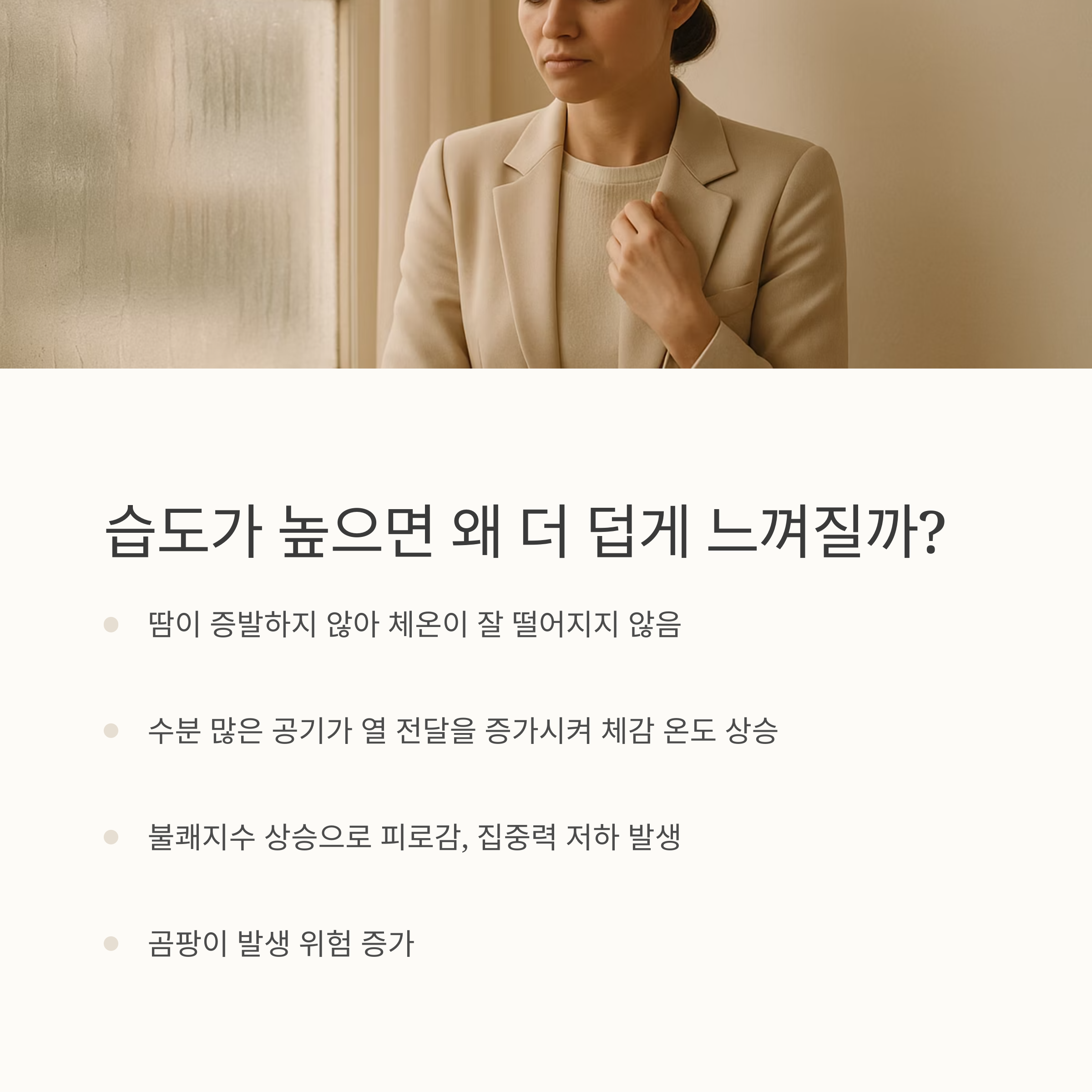 - 불쾌지수 상승 → 피로감, 집중력 저하, 곰팡이 발생 위험