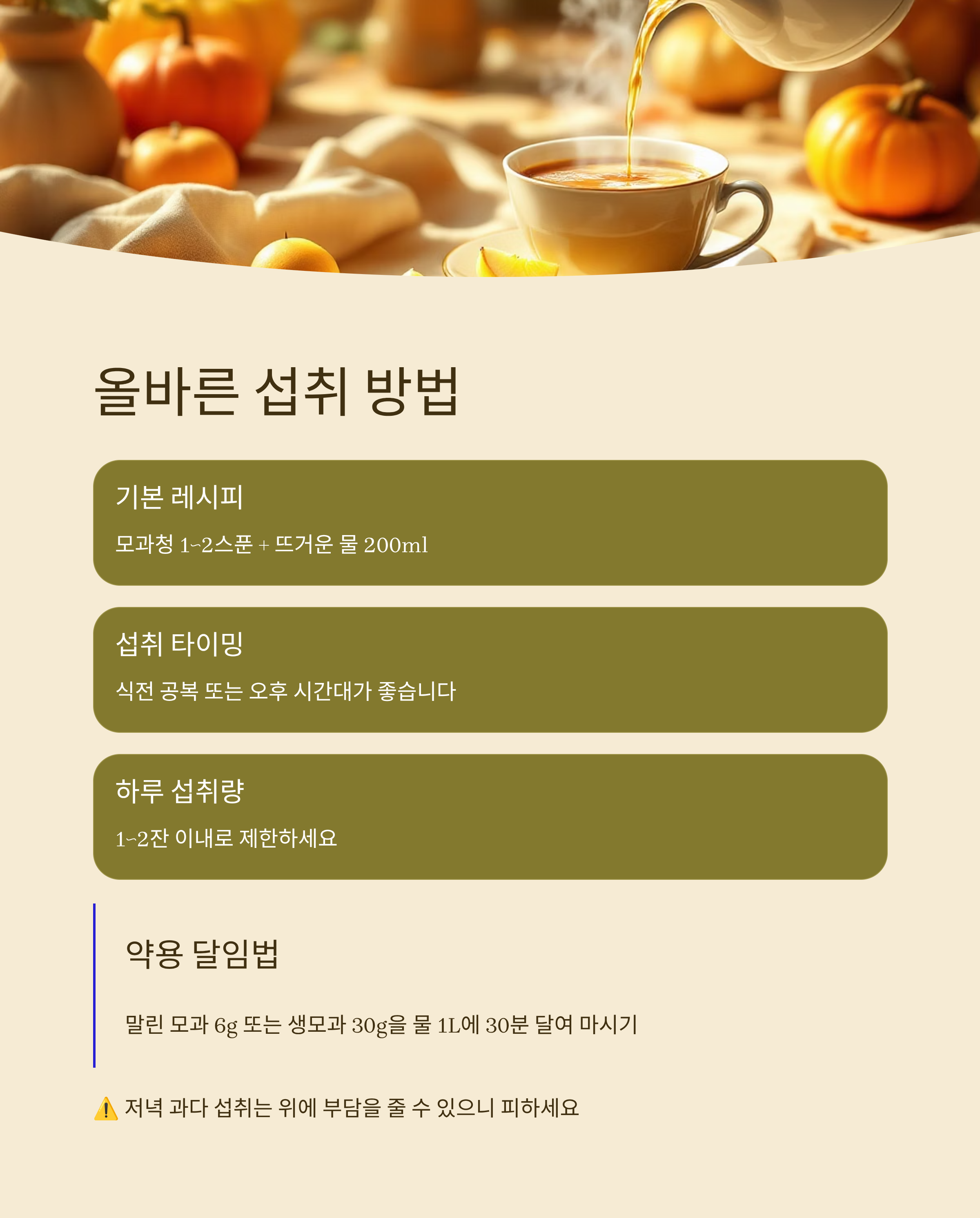 - 기본: 모과청 1~2스푼 + 뜨거운 물 200ml