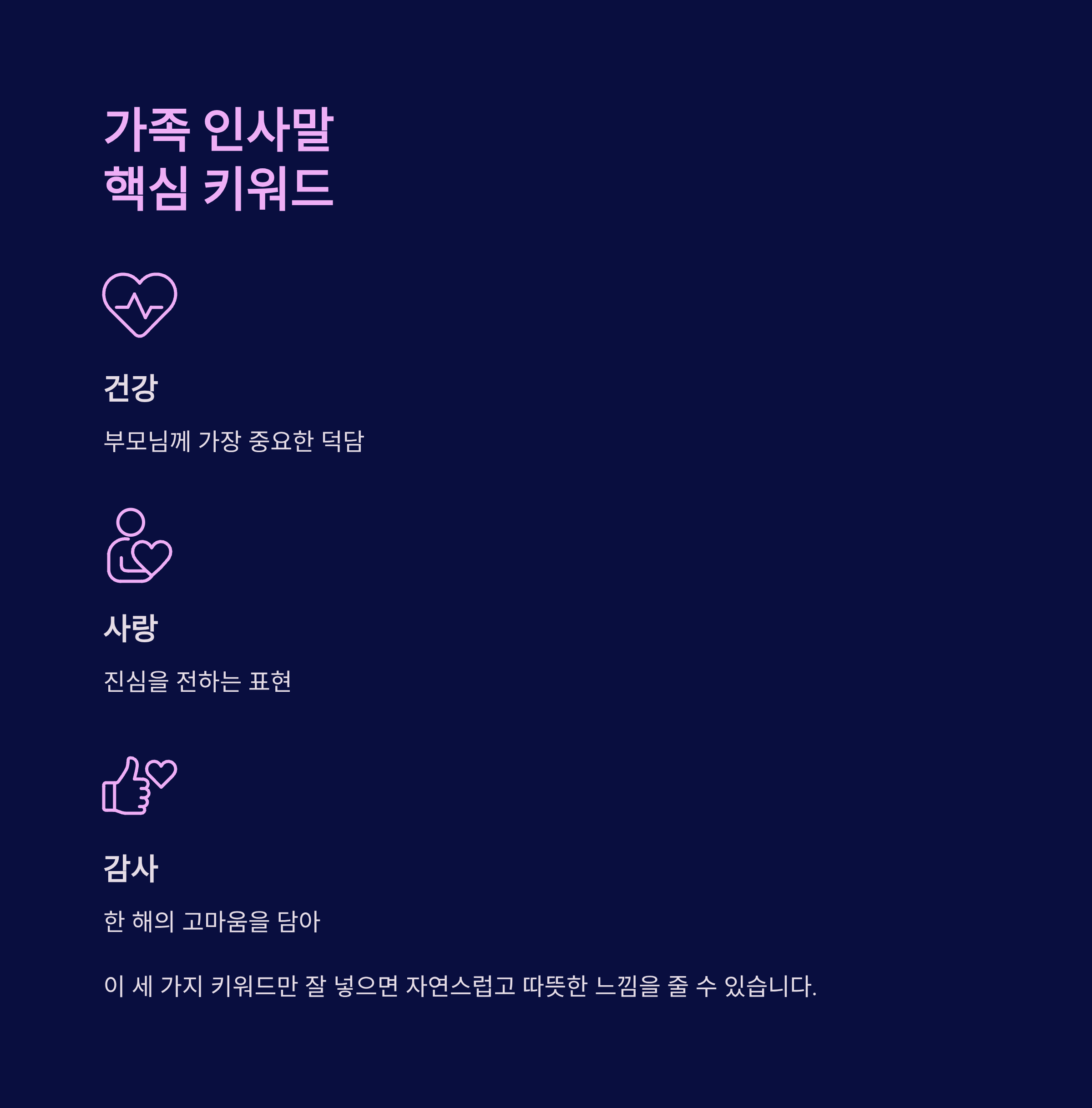 ✅ 포인트: ‘건강’, ‘사랑’, ‘감사’ 키워드만 잘 넣으면 자연스럽고 따뜻한 느낌을 줍니다.