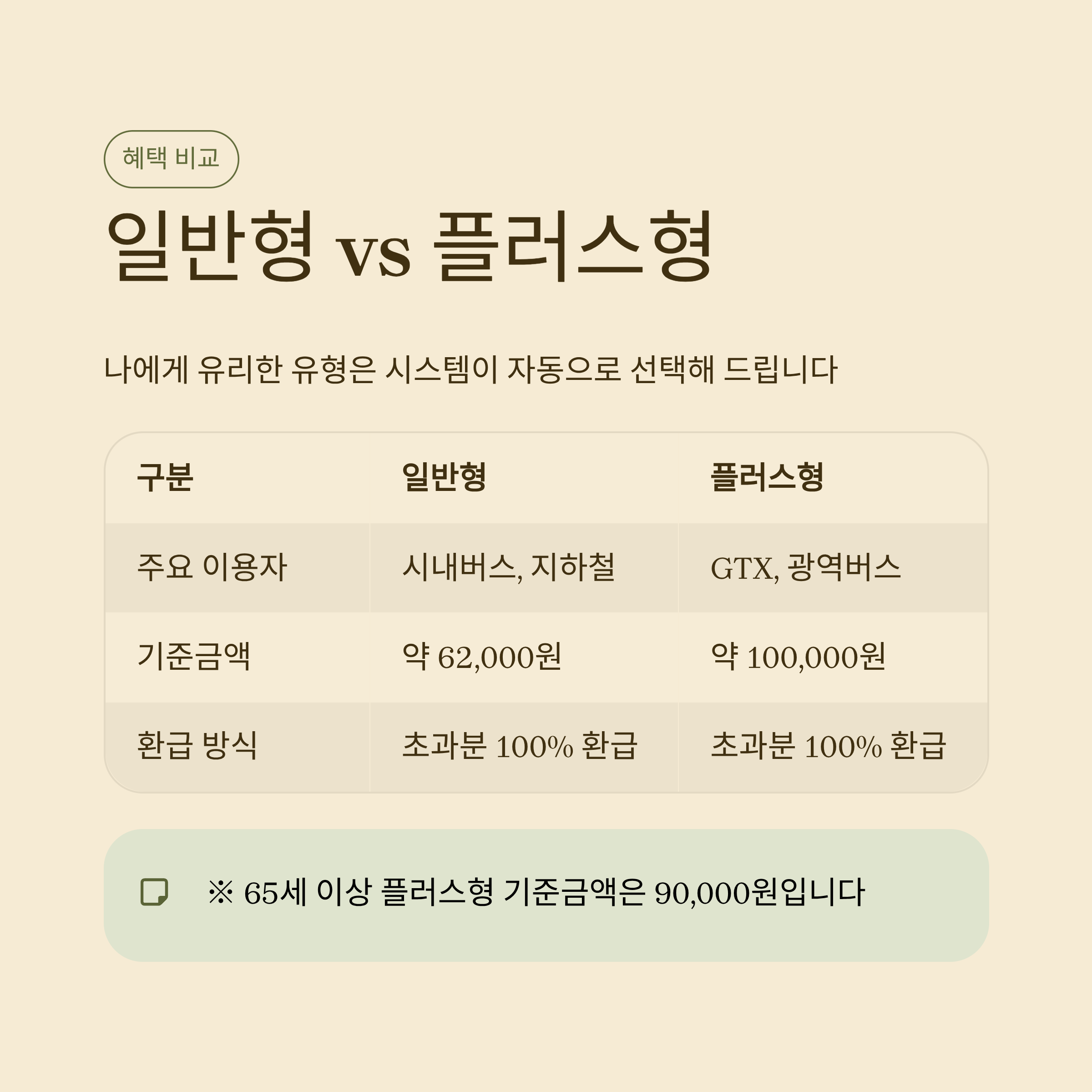 | 주요 이용자 | 시내버스, 지하철 이용자 | GTX, 광역버스 등 고가노선 이용자 |