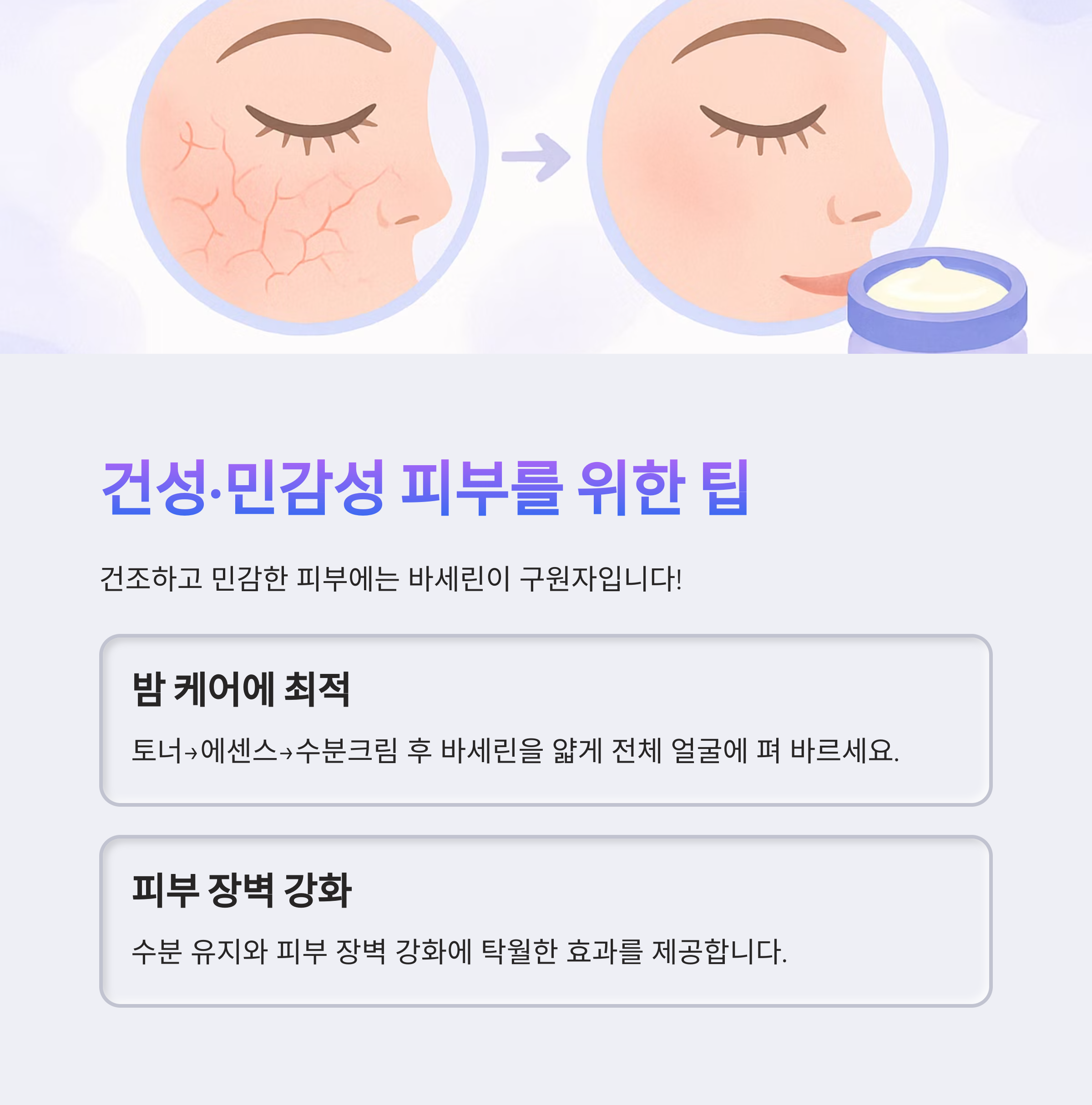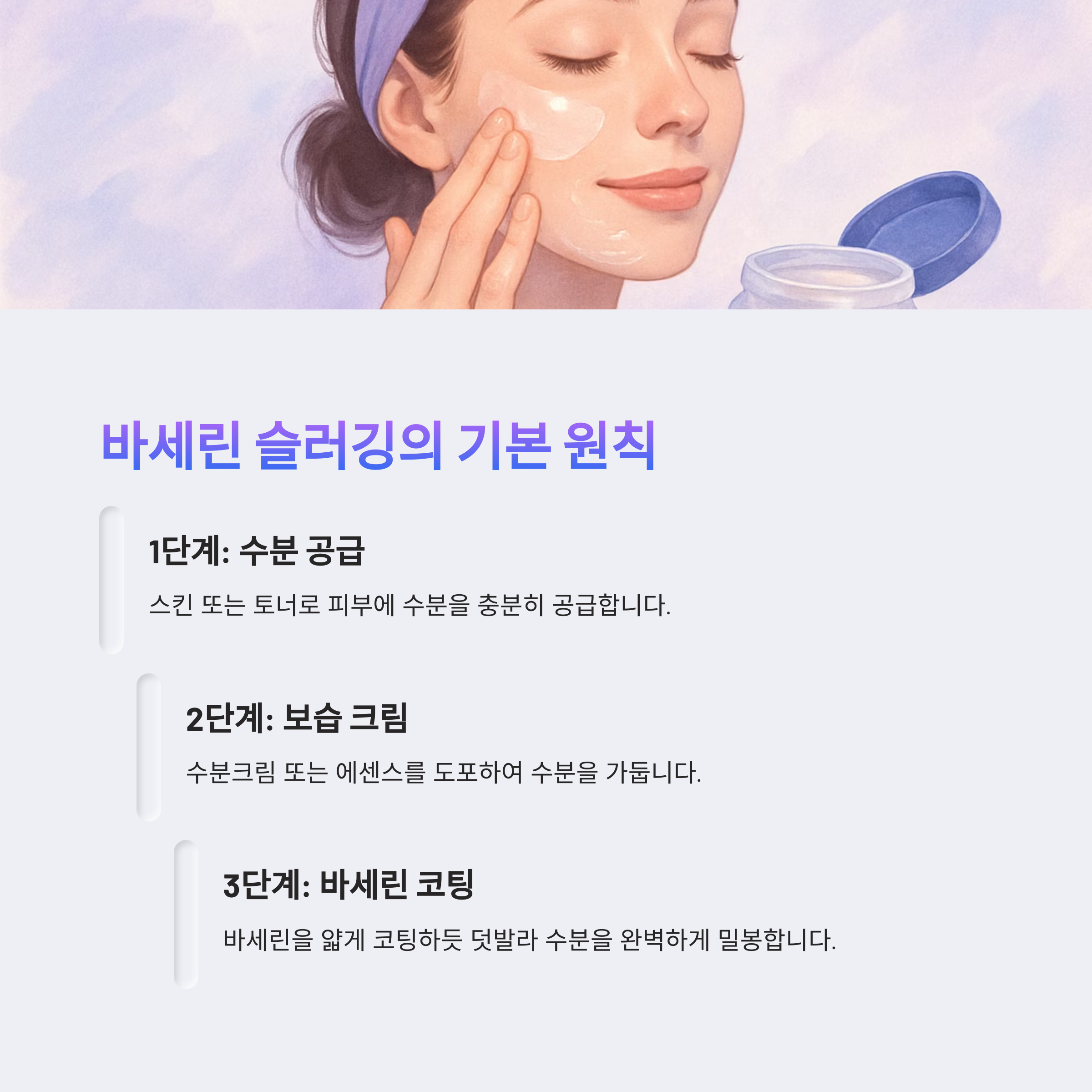 ① 스킨 또는 토너로 피부 수분 공급 → ② 수분크림 또는 에센스 도포 → ③ 바세린을 얇게 코팅하듯 덧바르기 - 이 순서가 피부 수분을 가두는 핵심입니다.