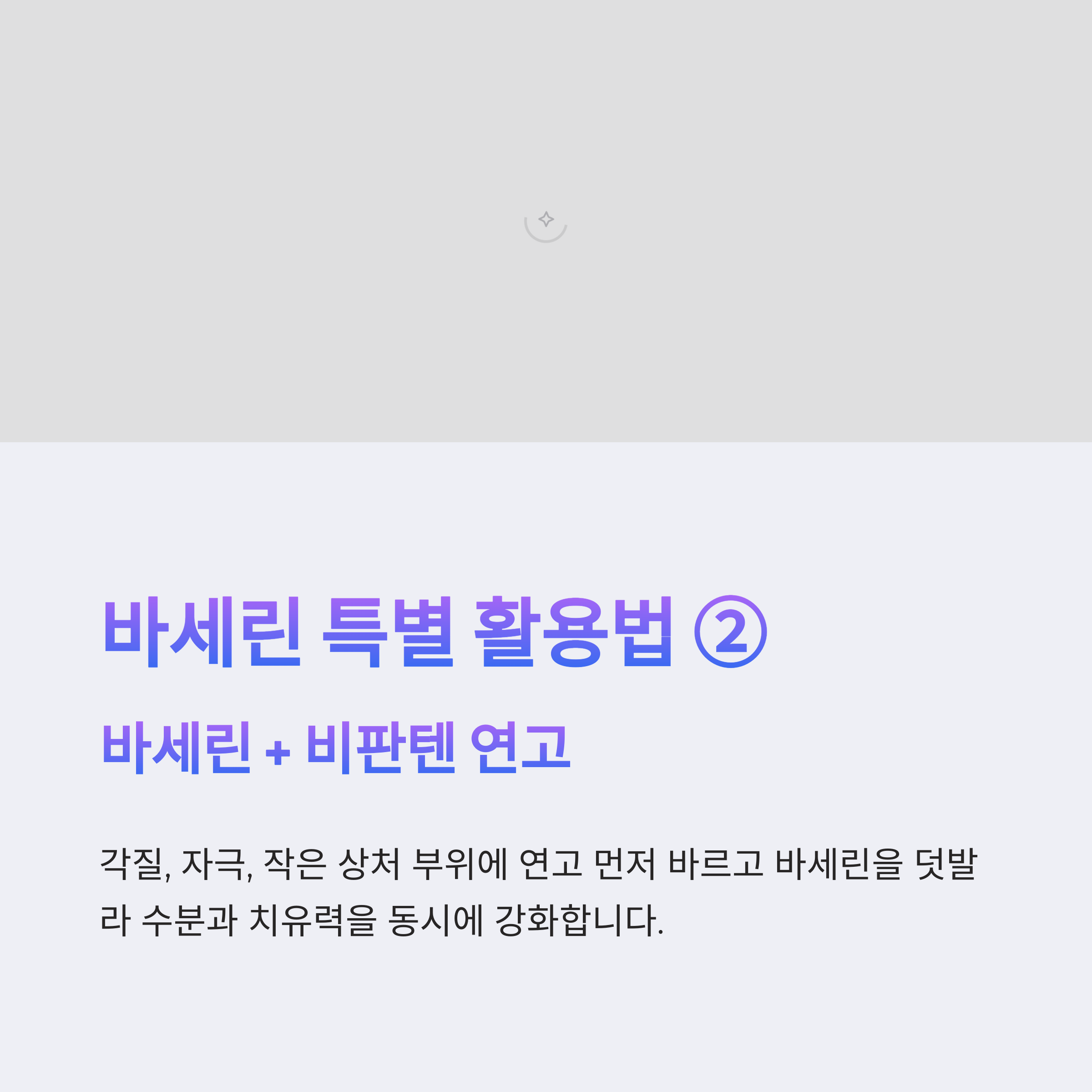 - 각질, 자극, 작은 상처 부위에 연고 먼저 바르고 바세린을 덧발라 수분과 치유력을 동시에 강화합니다.