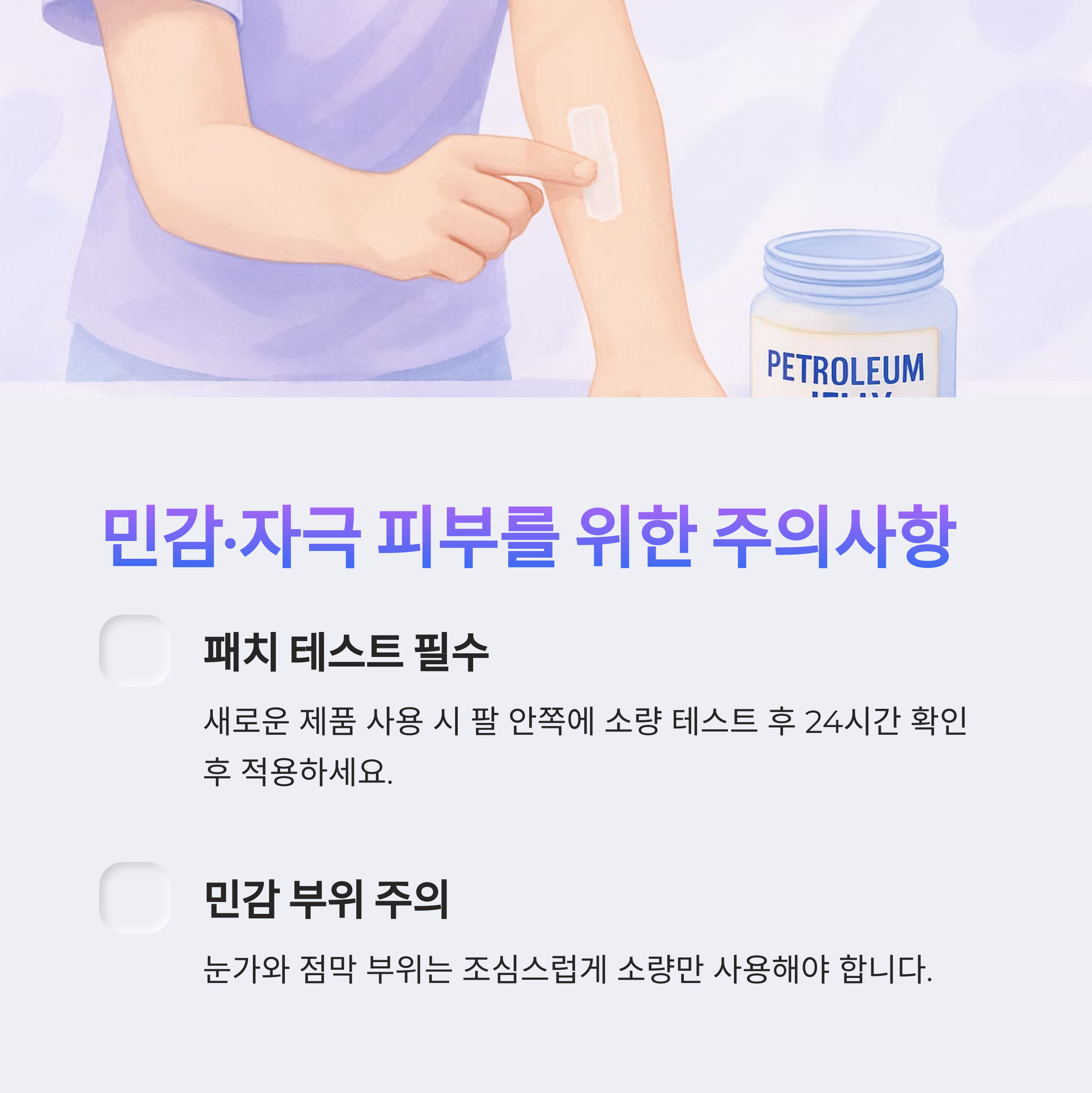- 순수 페트롤라툼 제품 권장 – 무향·무첨가 제품이 피부 자극 없이 안전합니다.