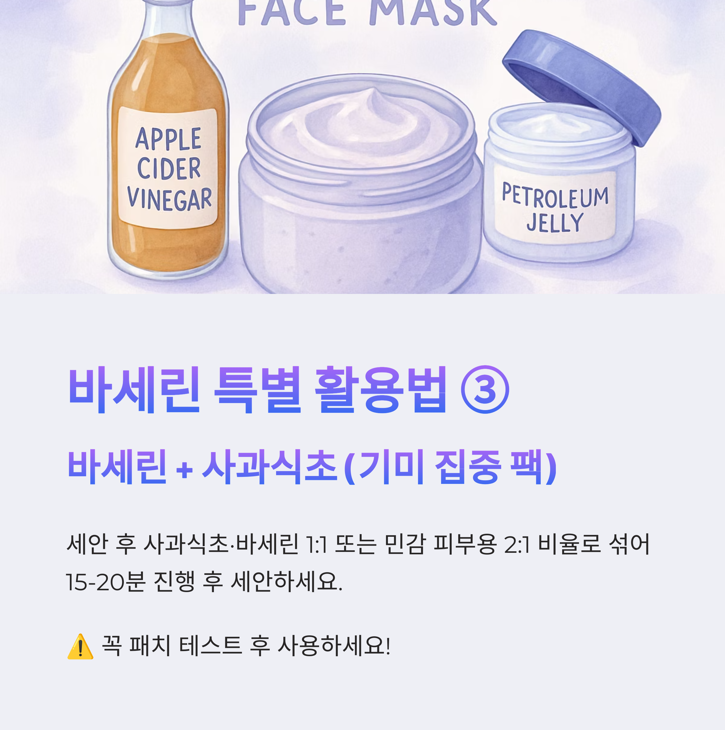 - 세안 후 사과식초·바세린 1:1 또는 민감 피부용 2:1 비율로 섞어