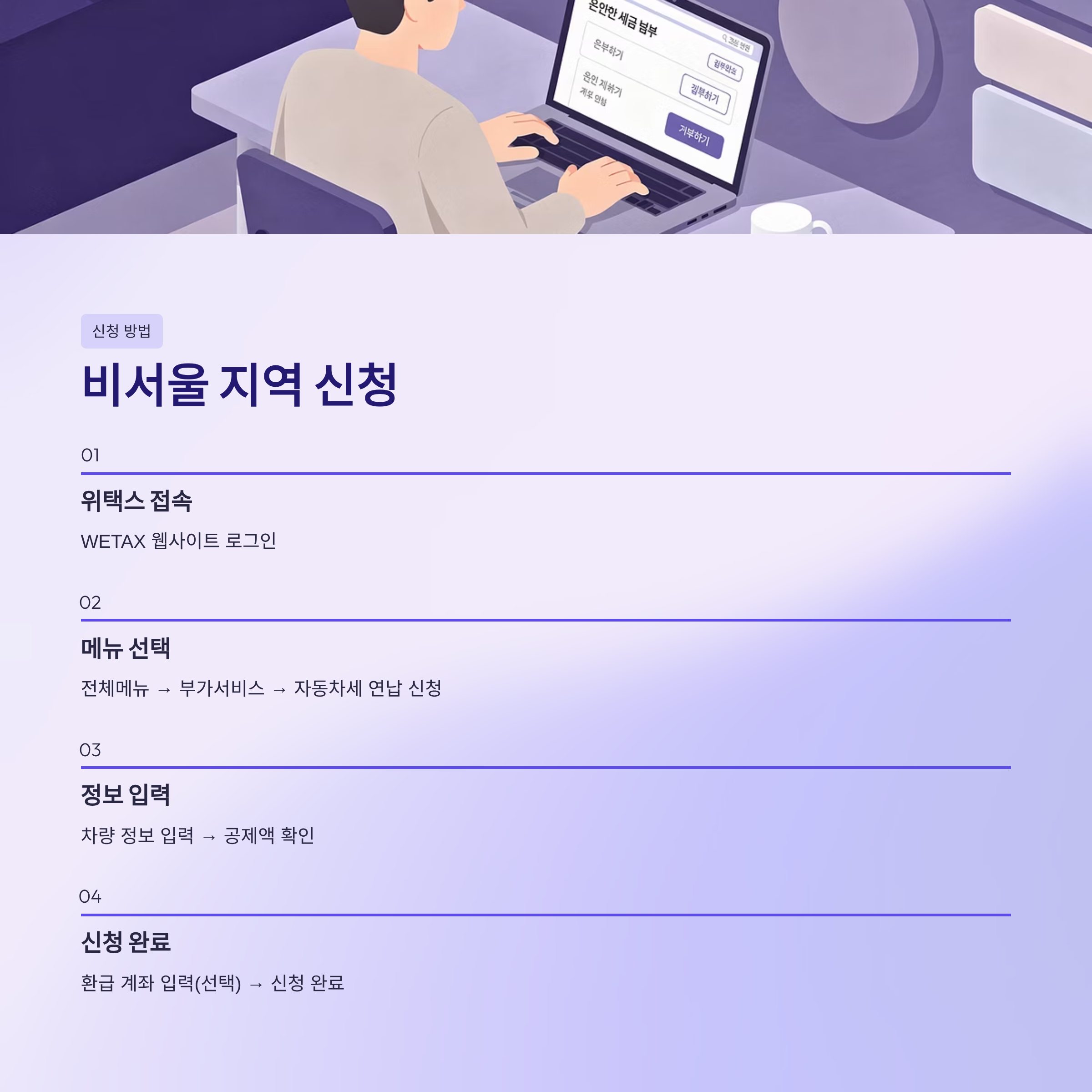 - 지자체별 신청 시간 상이: 위택스 공지사항 또는 지자체 홈페이지 확인 필수