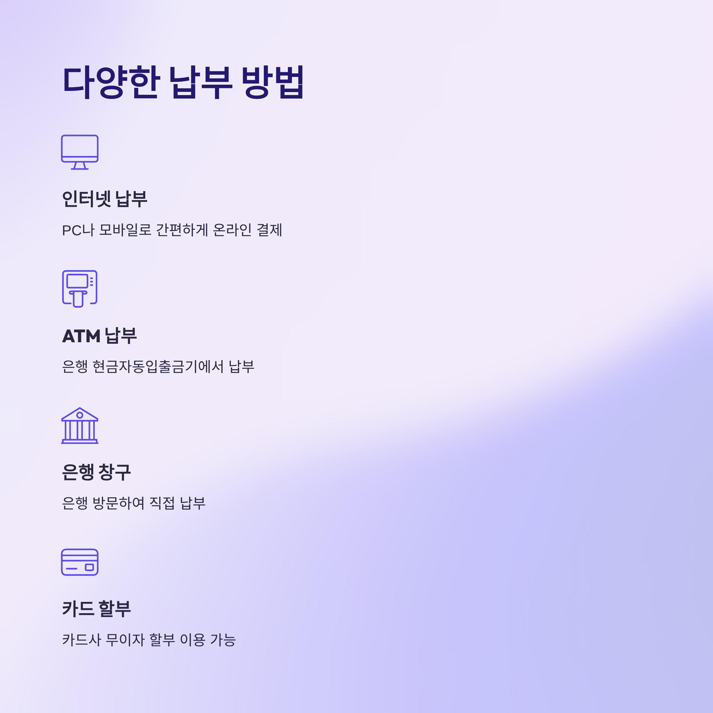 📌 납부는 인터넷, 모바일, ATM, 은행 창구, 카드사 무이자 할부 등 다양하게 가능합니다.