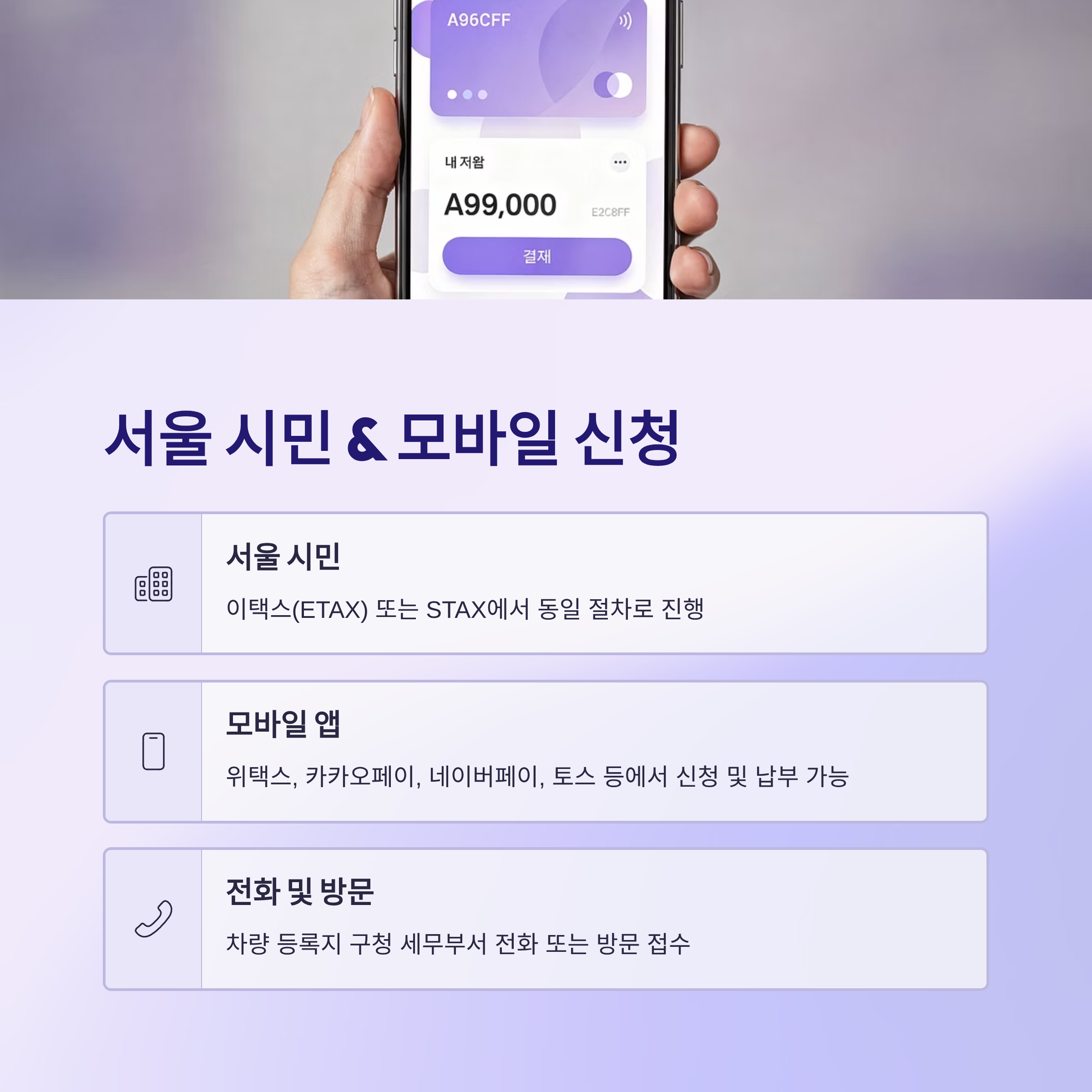 - 차량 등록지 구청 세무부서에 전화 신청 또는 방문 접수도 가능