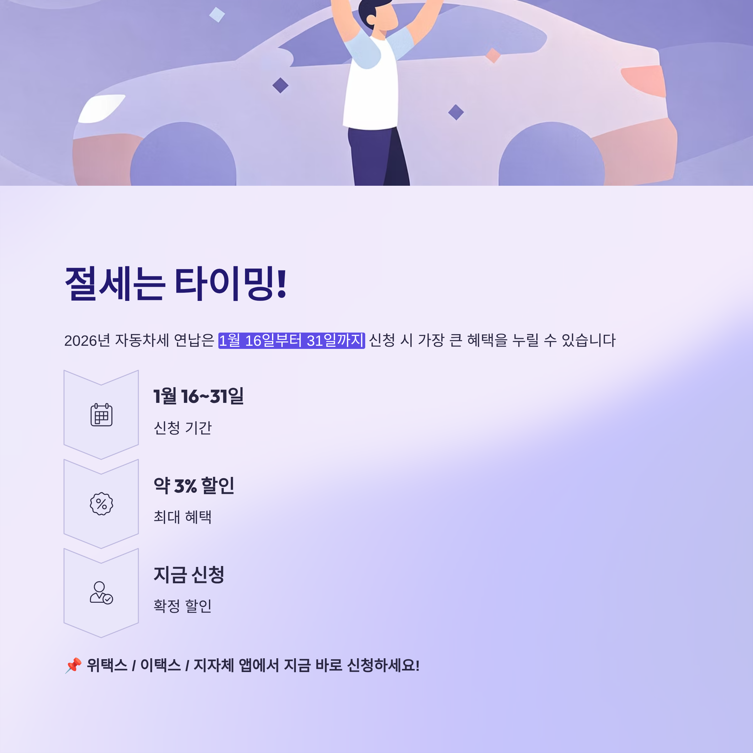 2026년 자동차세 연납은 1월 16일부터 31일까지 신청 시 가장 큰 혜택을 누릴 수 있습니다.