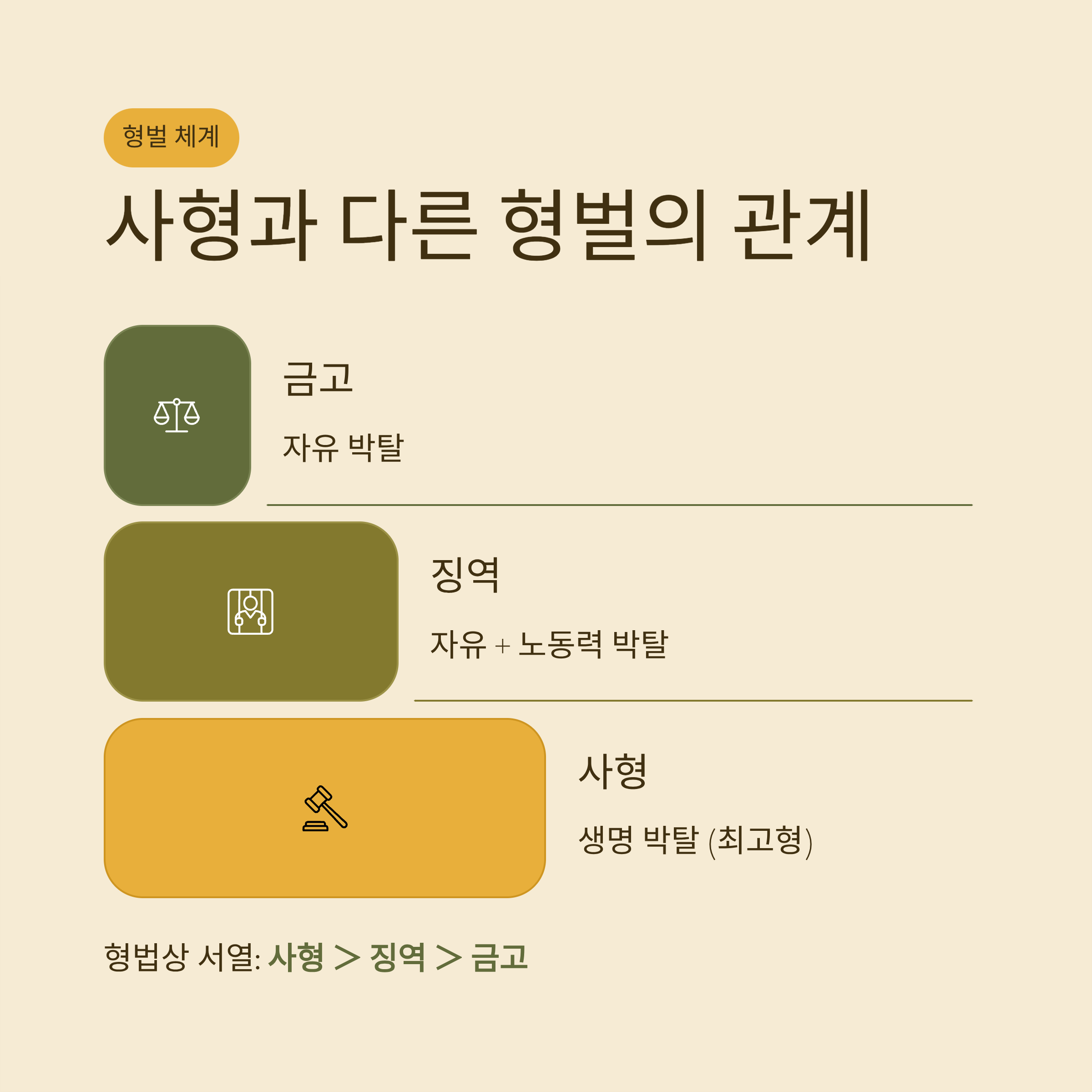 - 사형: 생명을 박탈하는 가장 무거운 형벌. 우리 법상 존재하지만 1997년 이후 집행은 중단됨.