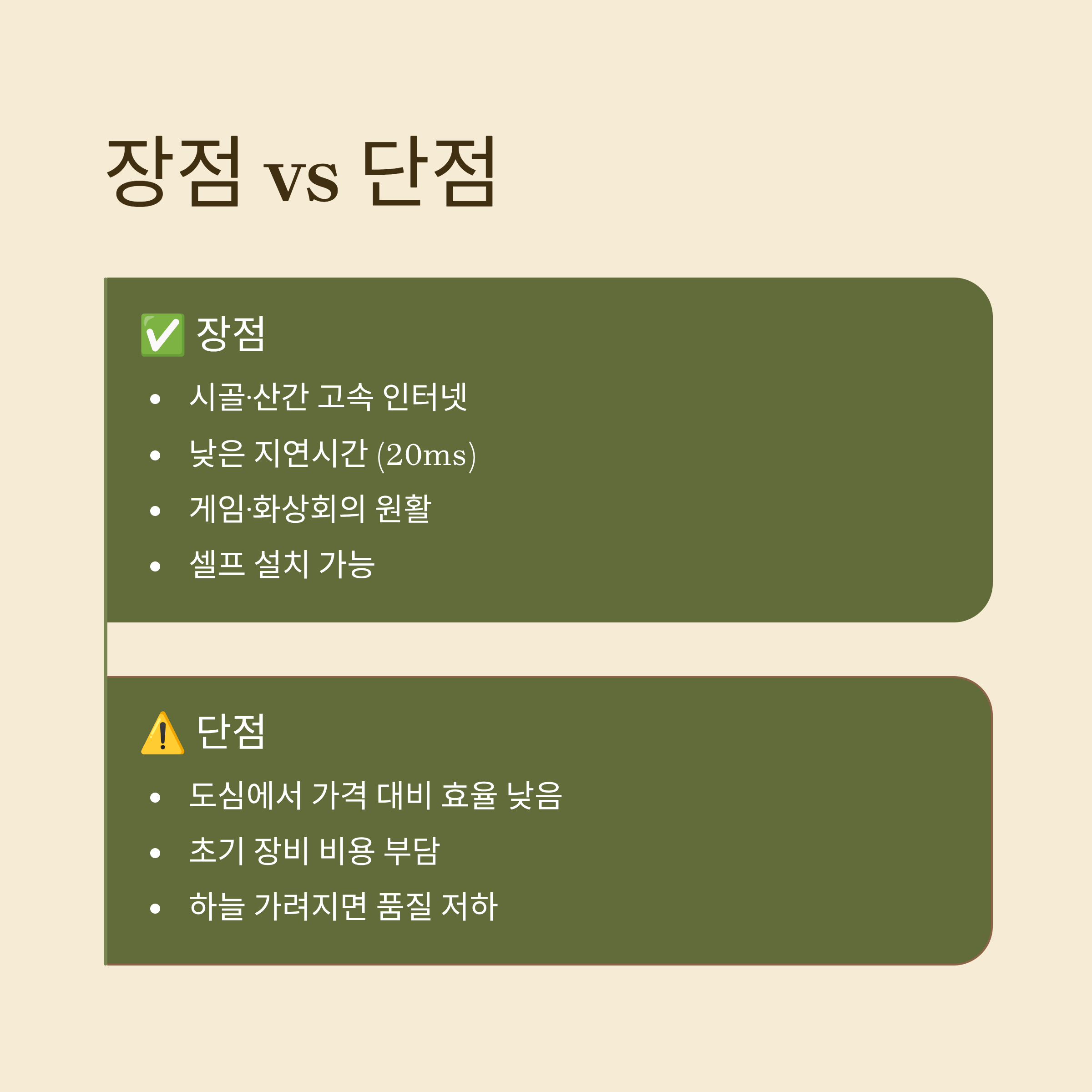 | 시골·산간에서도 고속 인터넷 가능 | 도심에서는 가격 대비 효율 낮음 |