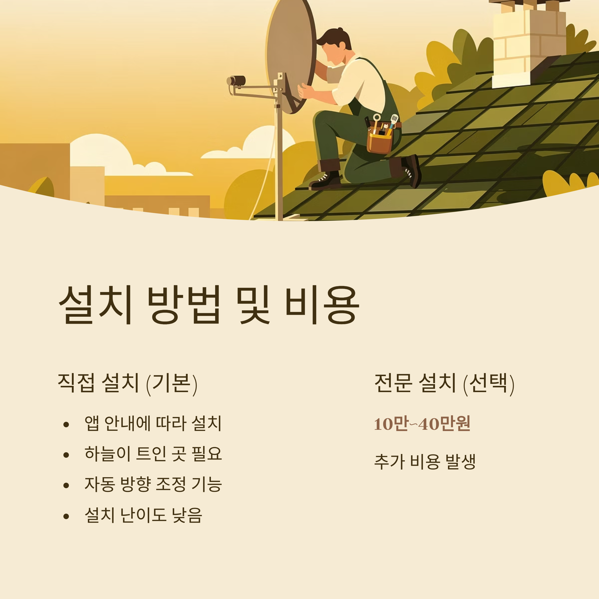 - 직접 설치가 기본입니다. 앱 안내에 따라 옥상, 마당 등 하늘이 트인 곳에 설치하면 되며,