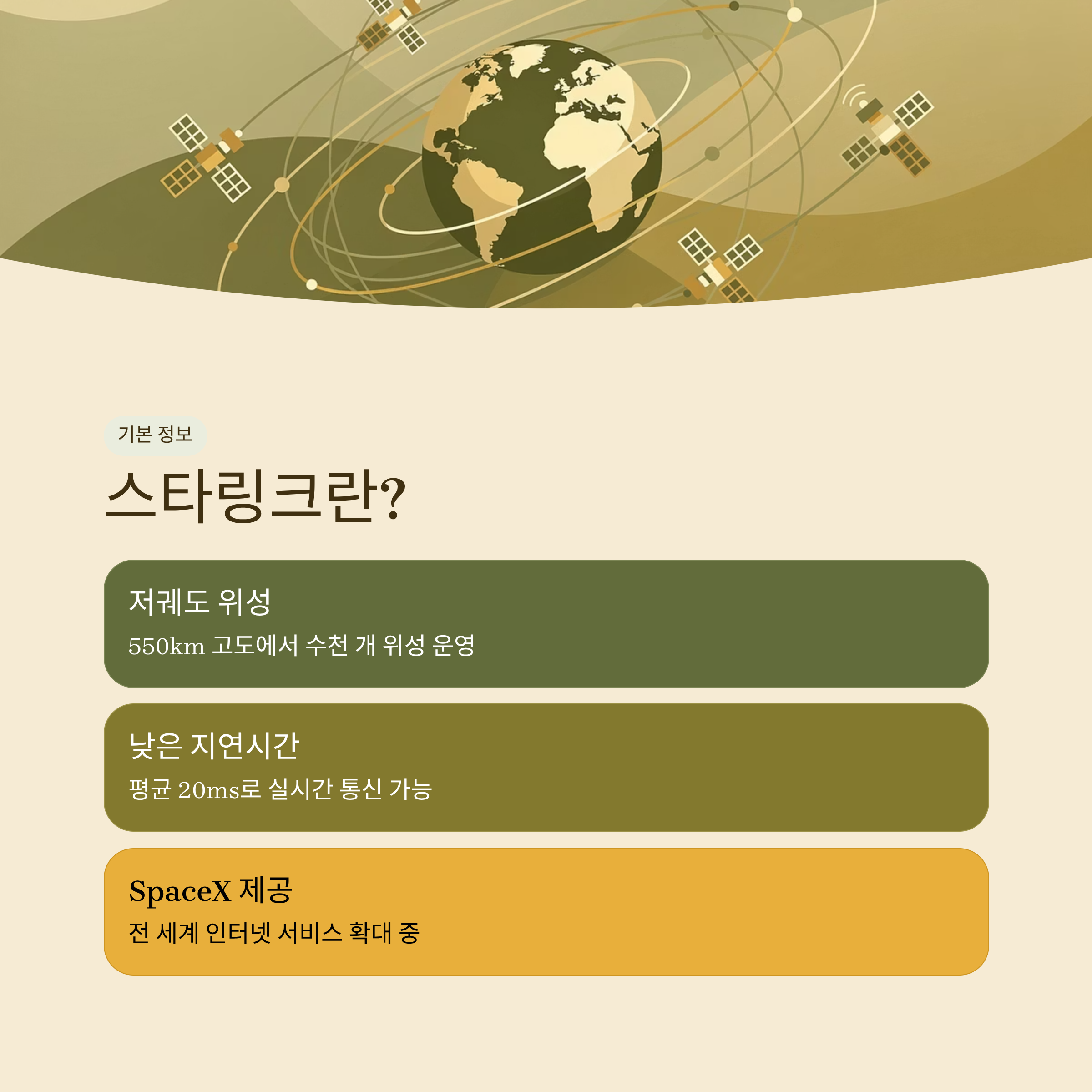 스타링크는 지구 저궤도(약 550km)에 띄운 수천 개의 위성을 통해 인터넷을 제공합니다. 기존 정지궤도 위성보다 훨씬 낮은 고도로 인해 지연시간이 평균 20ms 내외로 낮아, 실시간 영상통화나 게임도 원활하게 이용 가능합니다.