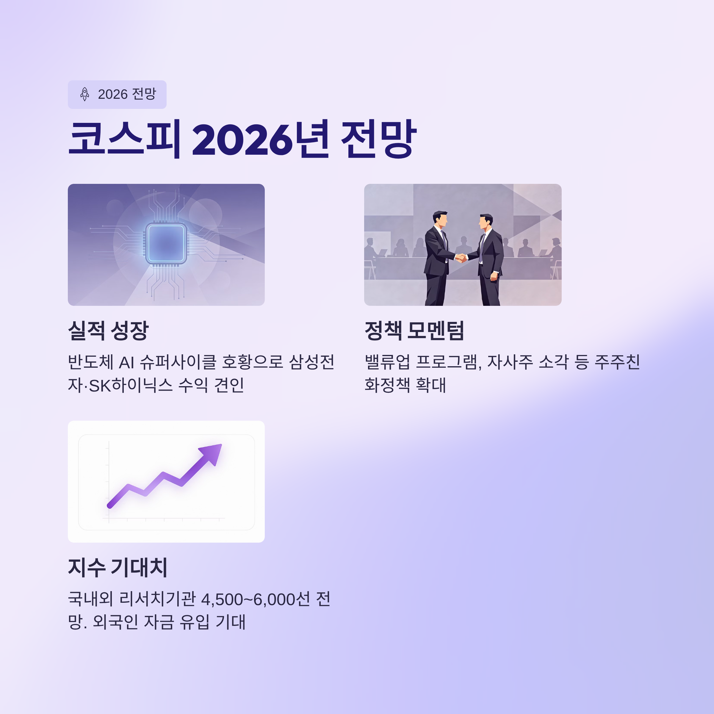 - 실적 성장: 반도체(AI·슈퍼사이클) 호황 → 삼성전자·SK하이닉스가 수익 견인