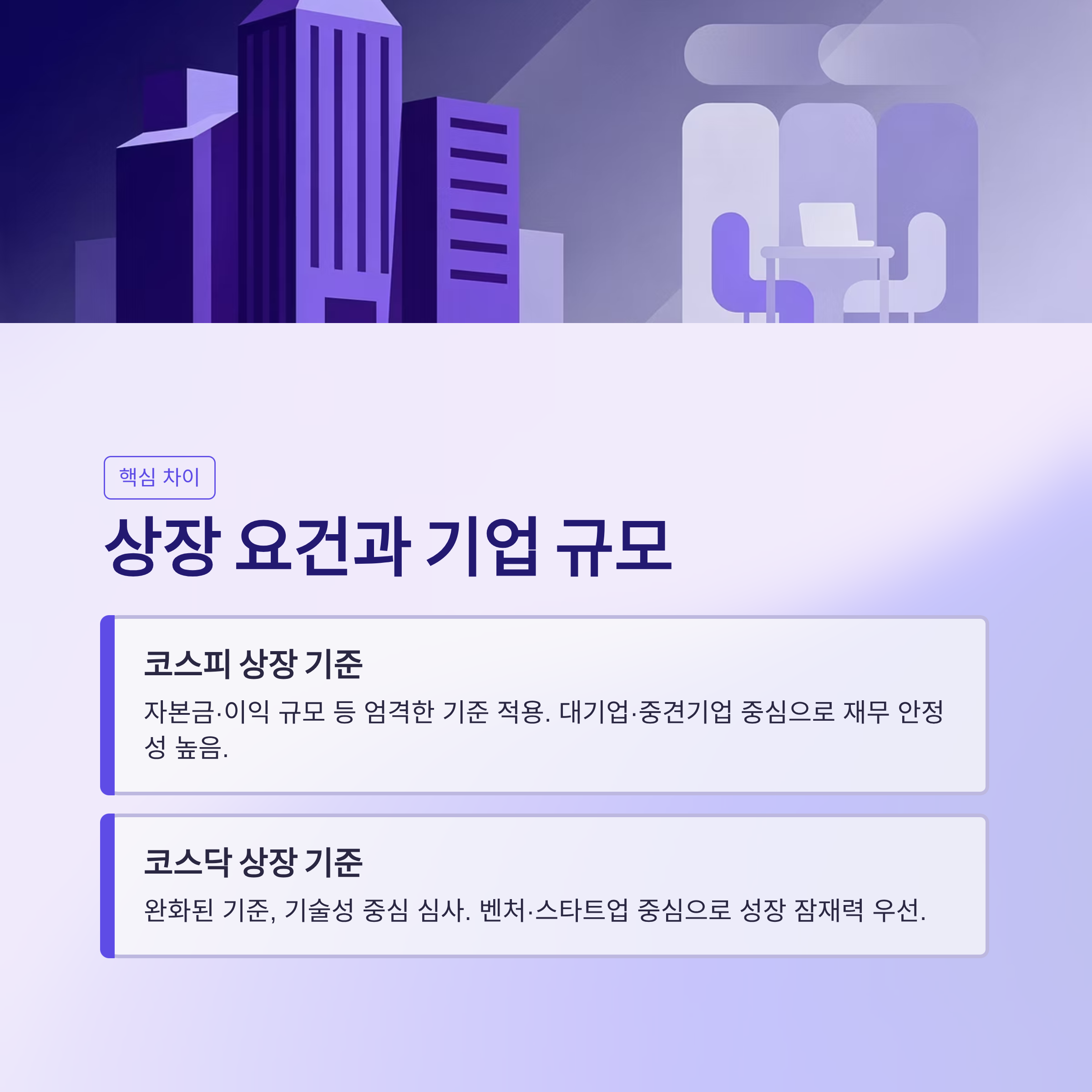| 상장 요건 | 자본금·이익 규모 등 엄격한 기준 적용 | 완화된 기준, 기술성 중심 심사 |