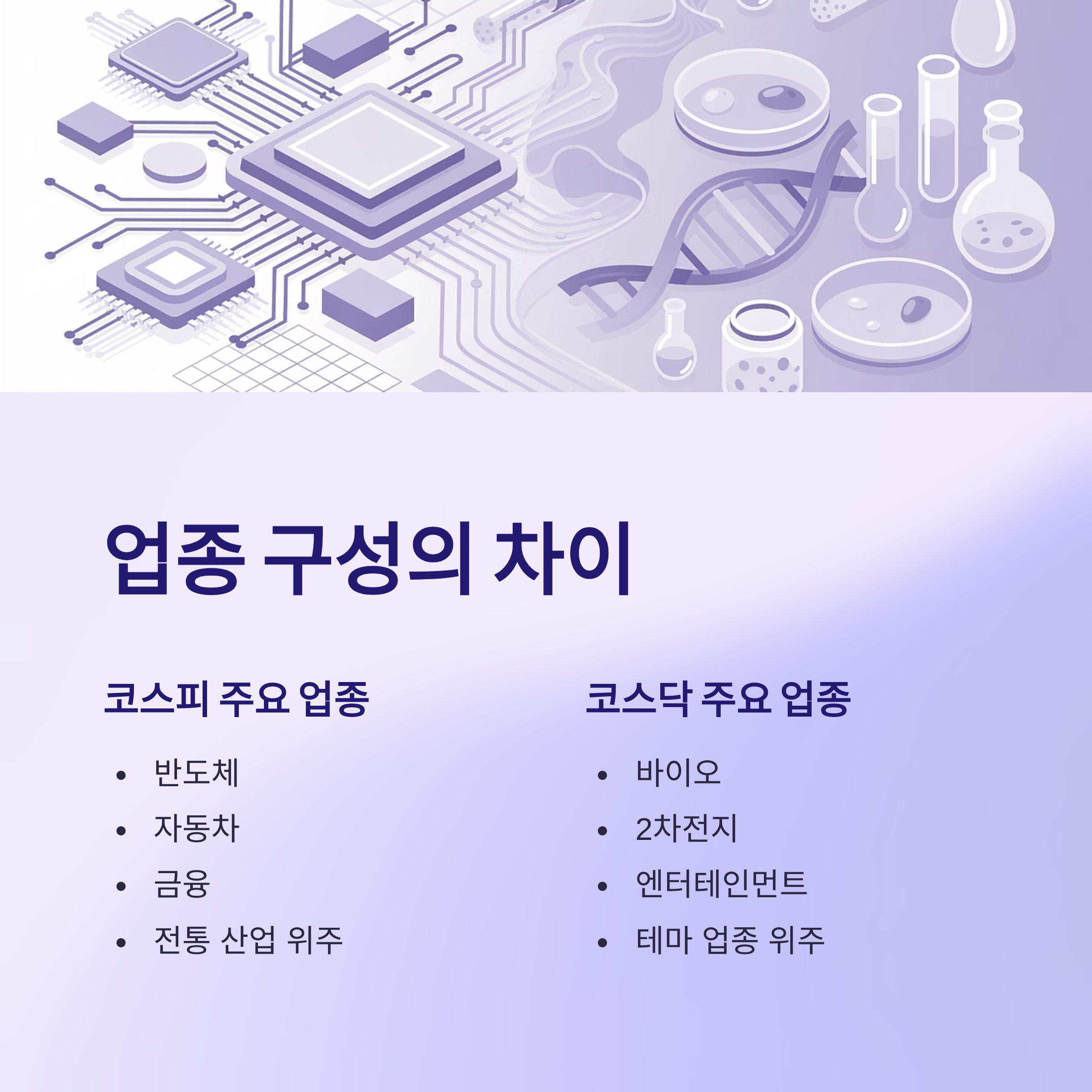 | 업종 구성 | 반도체·자동차·금융 등 전통 산업 위주 | 바이오·2차전지·엔터 등 테마 업종 위주 |