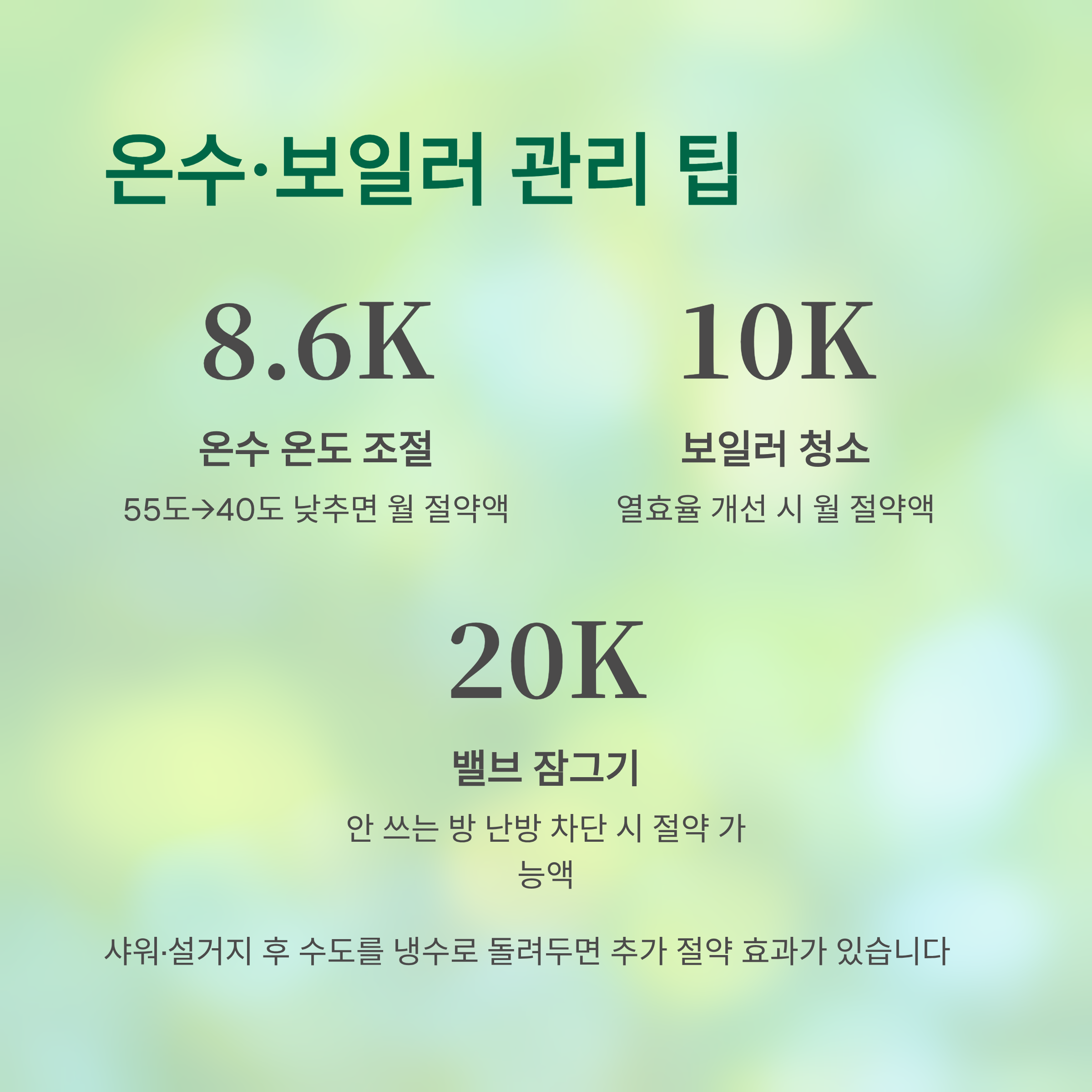 - 온수 온도 55도 → 40도로 낮추기 → 한 달 약 8,600원 절약