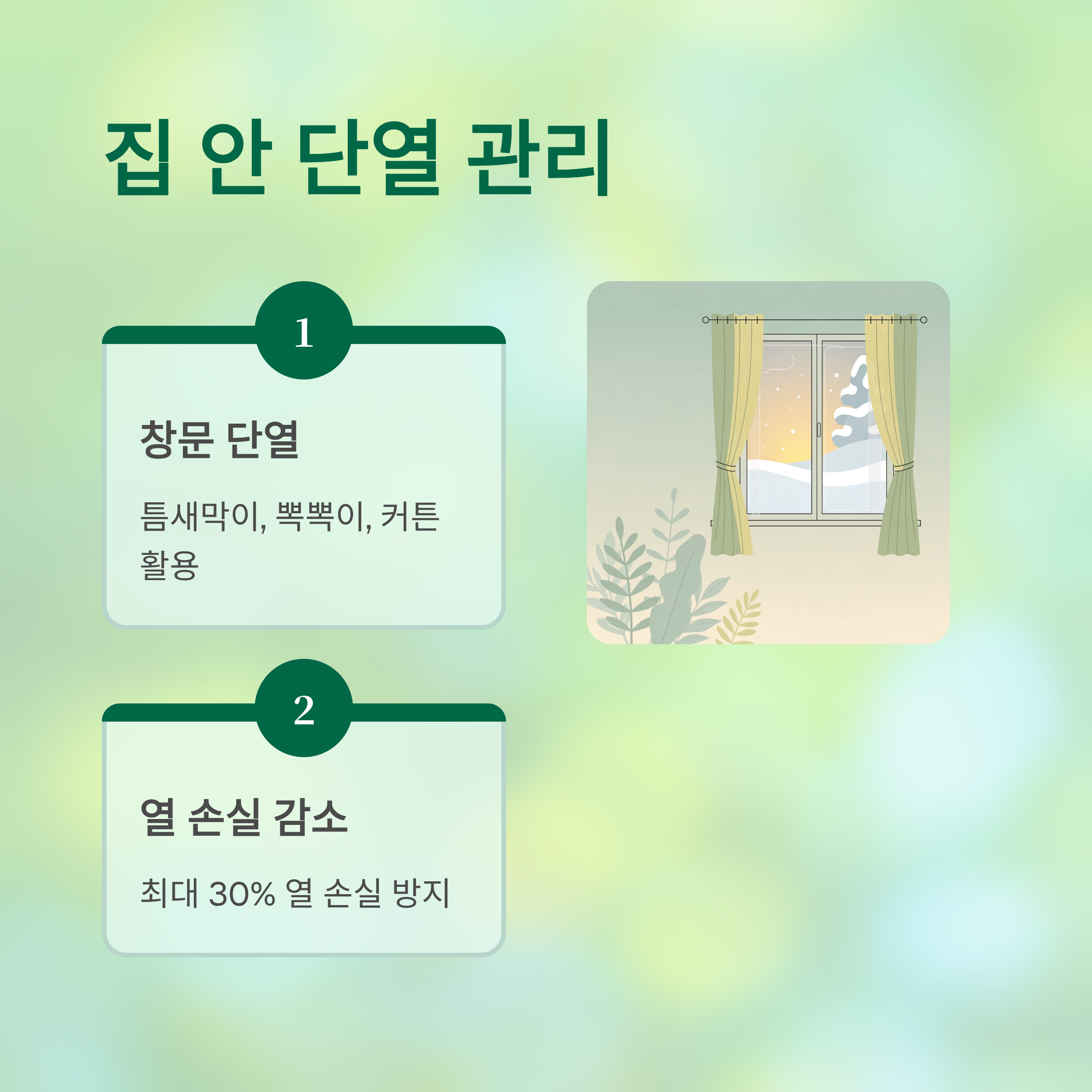 - 창문 단열 필수: 틈새막이, 뽁뽁이, 커튼 → 열 손실의 30% 감소