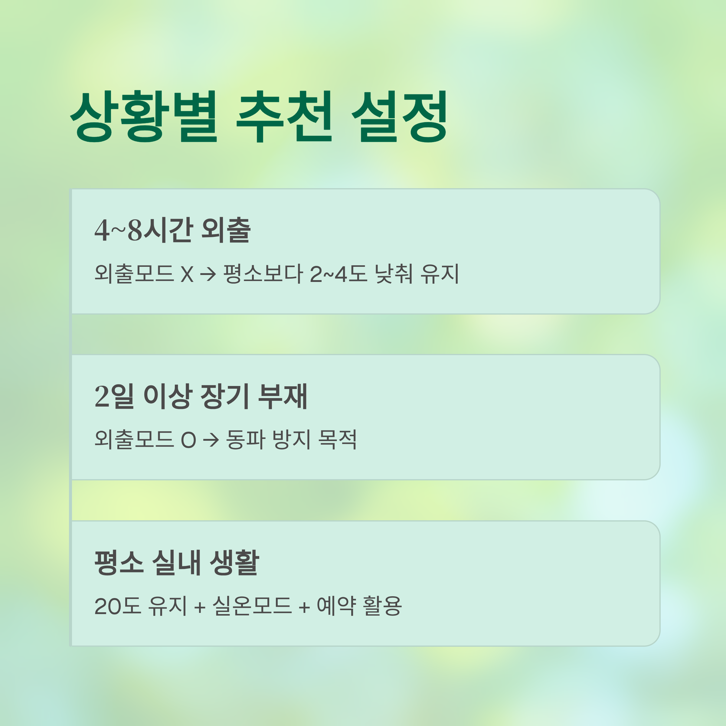 | 4~8시간 외출 | 외출모드 X → 평소보다 2~4도 낮춰 유지 |