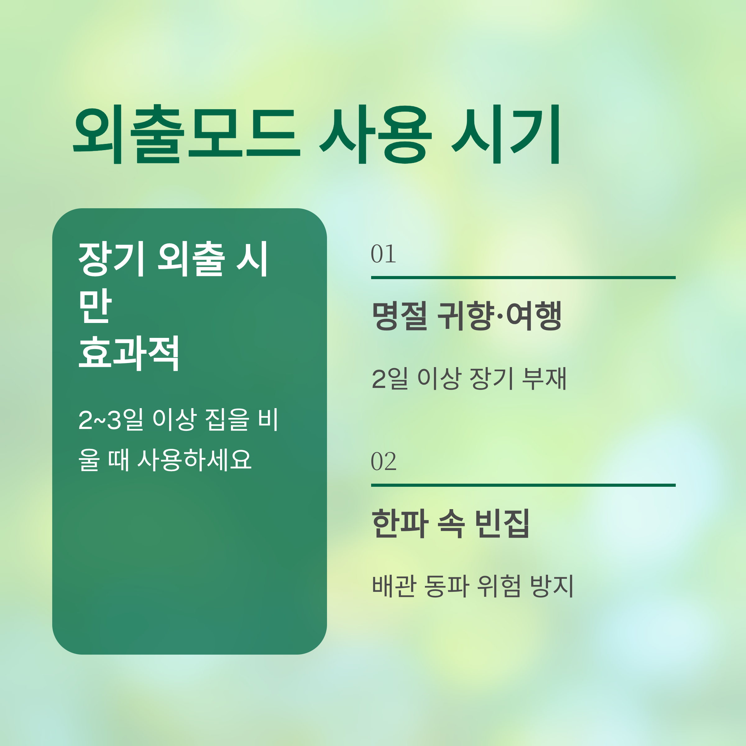 - 2~3일 이상 집 비울 때: 명절 귀향, 여행 등