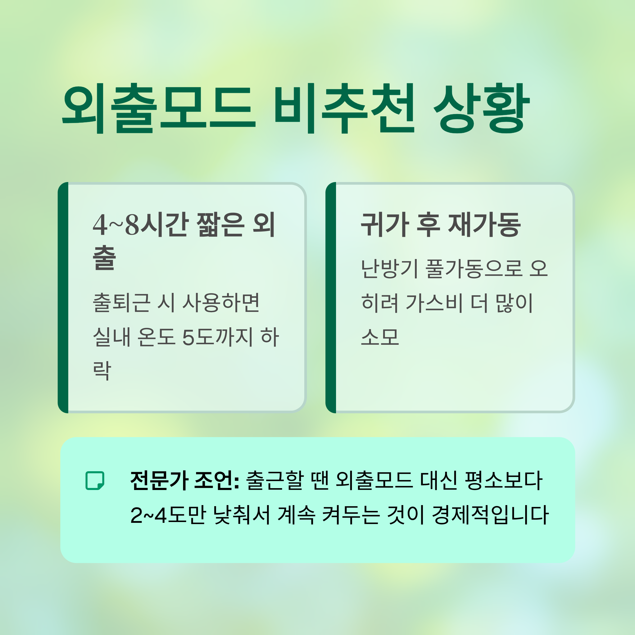 - 귀가 후 재가동 → 난방기 풀가동으로 오히려 가스비 더 많이 듬