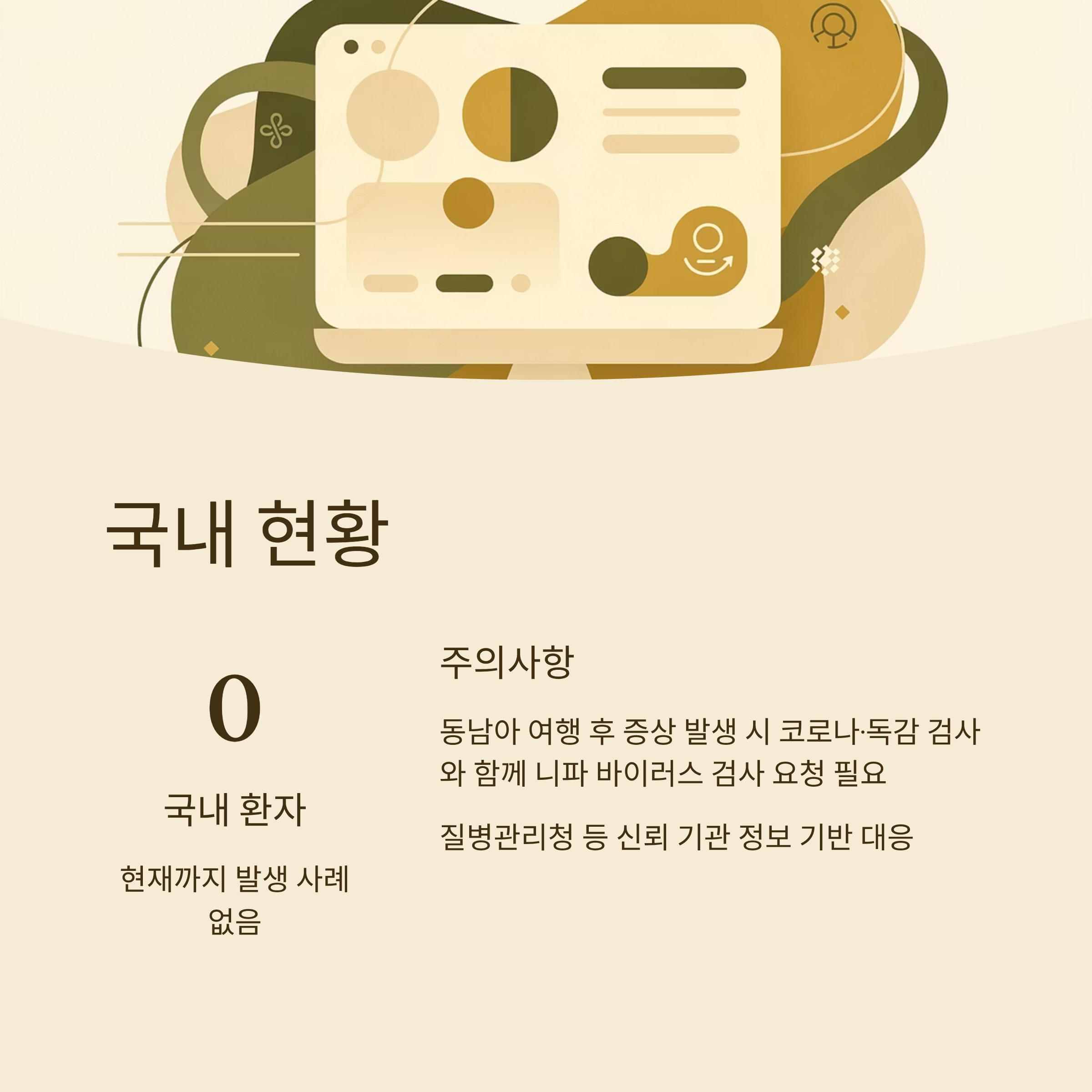 - 동남아 여행 후 증상 발생 시, 코로나·독감 검사와 함께 니파 바이러스 검사 요청 필요