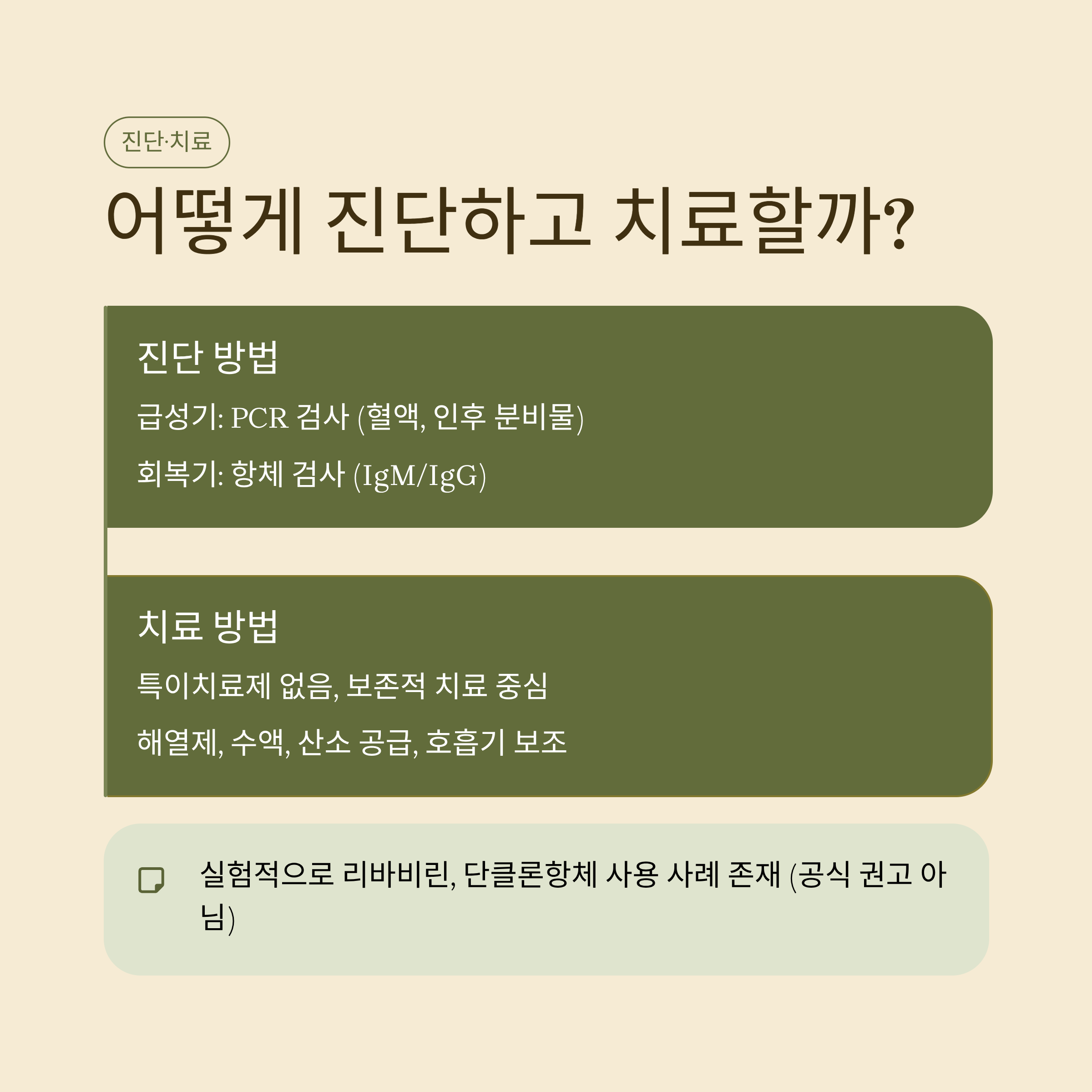 - 실험적으로 리바비린, 단클론항체 사용 사례 존재 (공식 권고 아님)