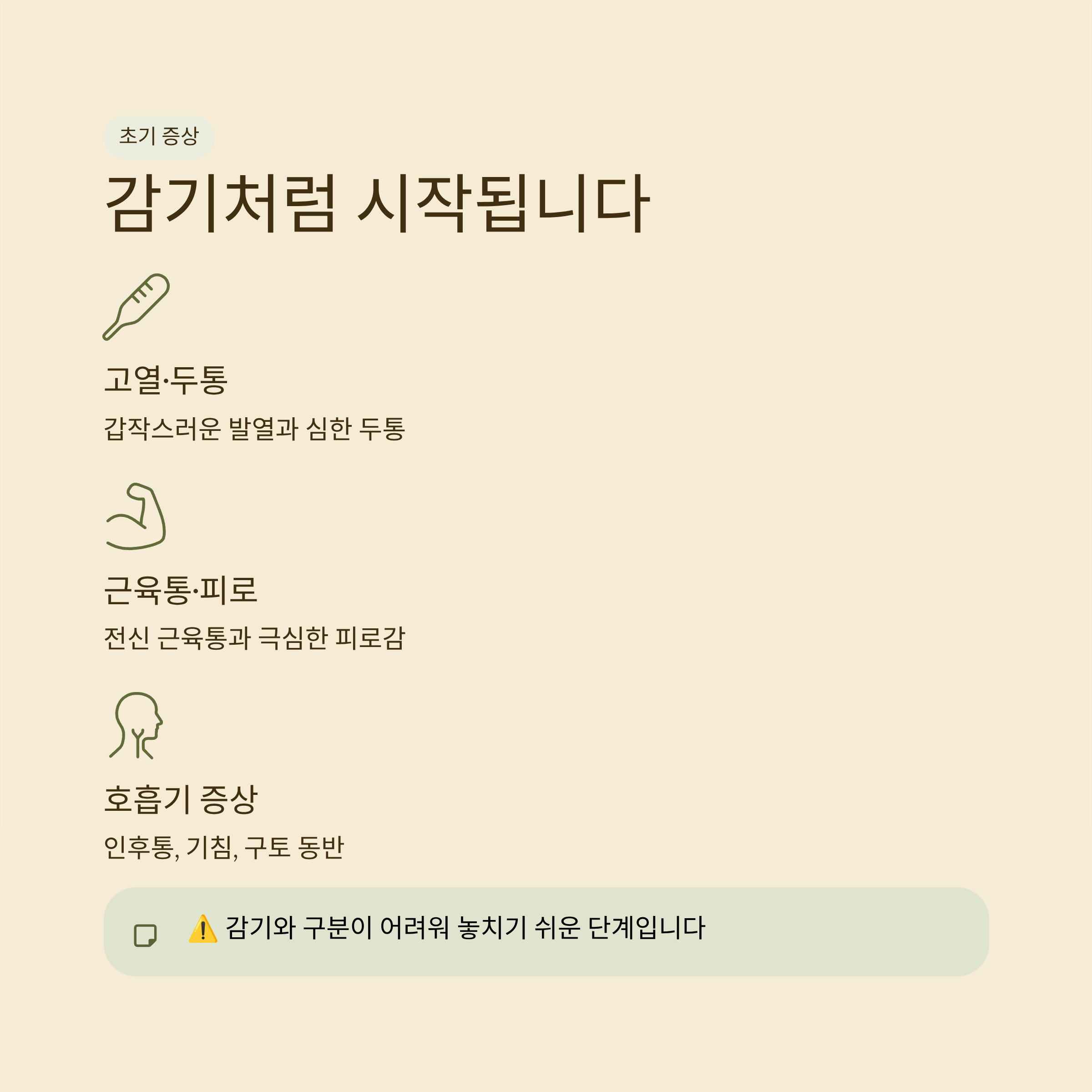 ➡ 경고 신호: 감기처럼 시작해 빠르게 중증으로 악화되는 경우, 반드시 의료기관을 찾아야 합니다.