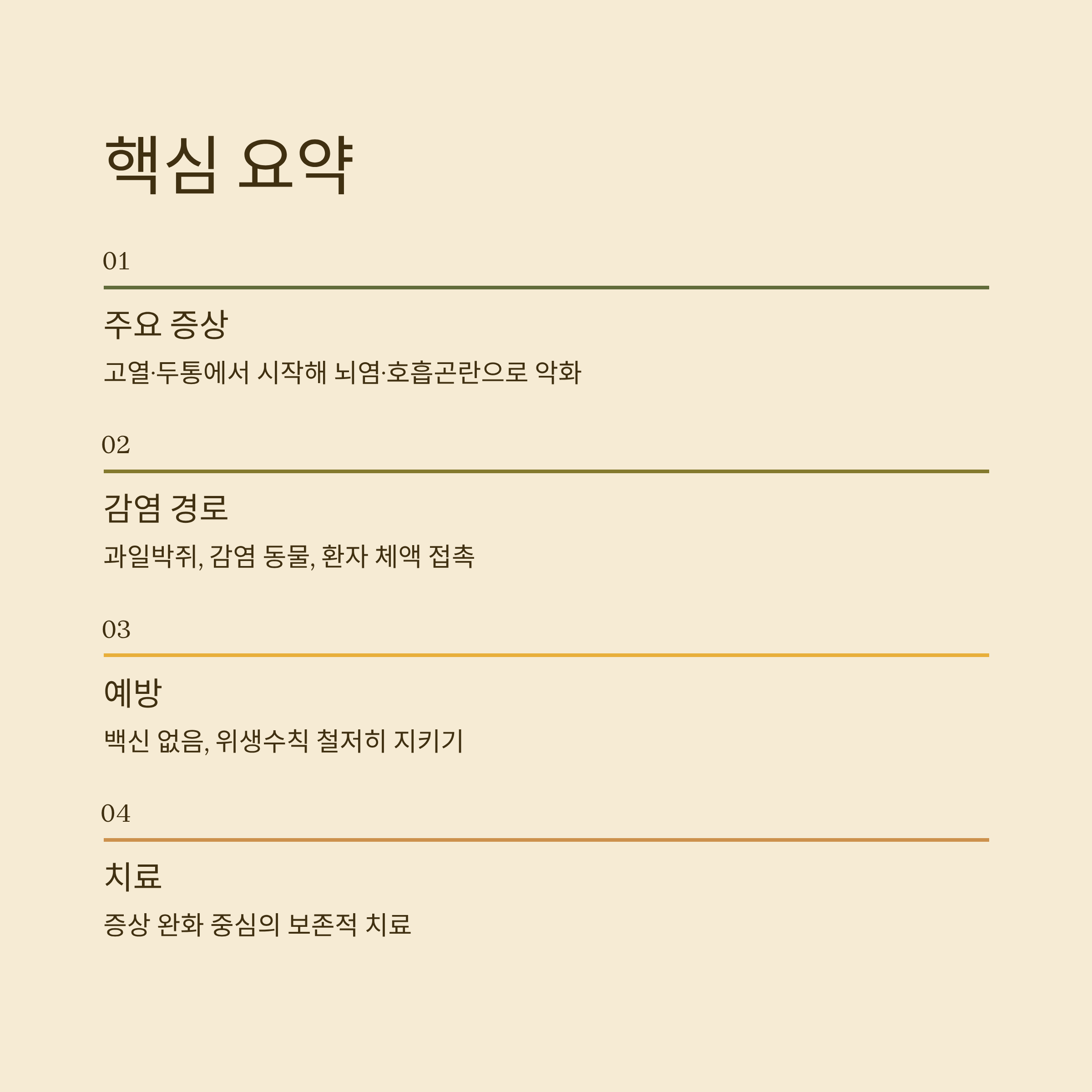 | 주요 증상 | 고열, 두통 → 뇌염·호흡곤란 |