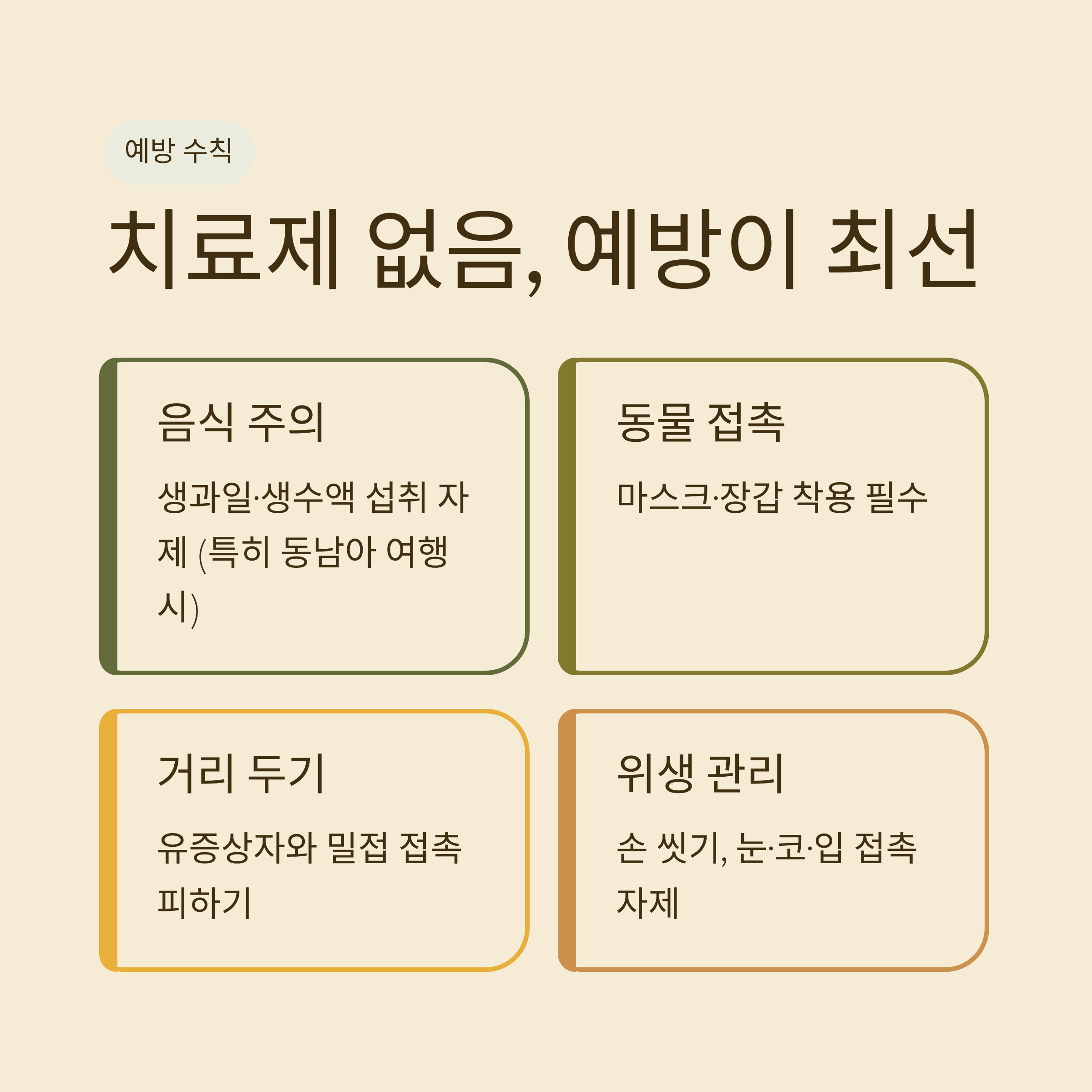 - 주의사항: 불안 조장은 피하고, 신뢰할 수 있는 기관(질병관리청 등) 정보 기반으로만 안내해야 합니다