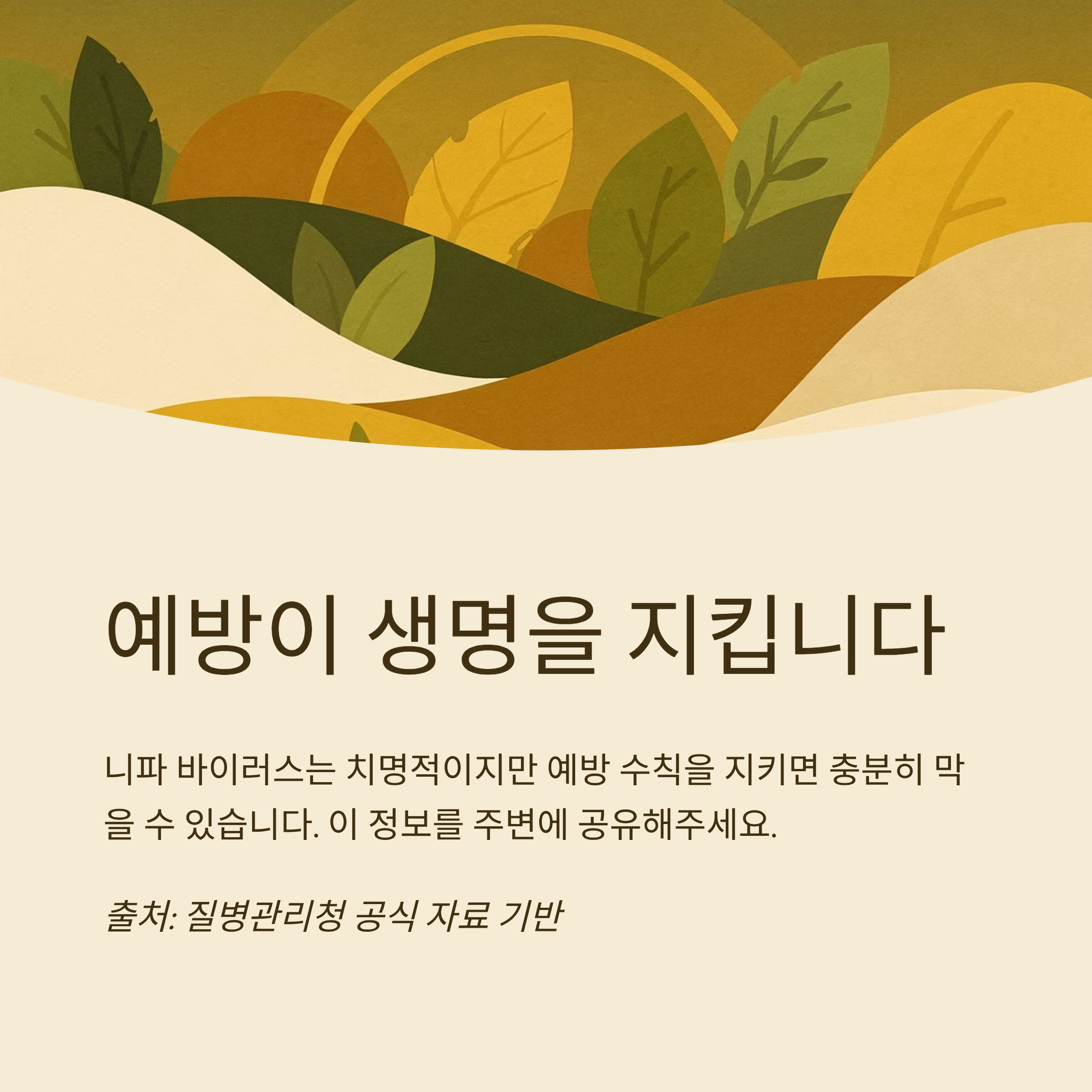 현재 니파 바이러스에는 승인된 백신이나 치료제 없음 → 예방이 최선의 방어입니다.