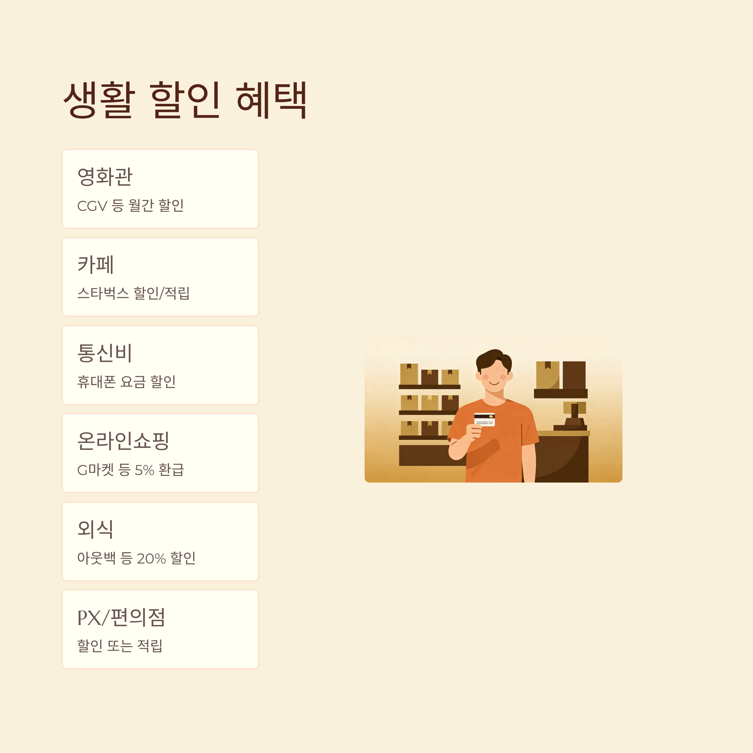 - 카페: 스타벅스 등 프랜차이즈 할인/적립