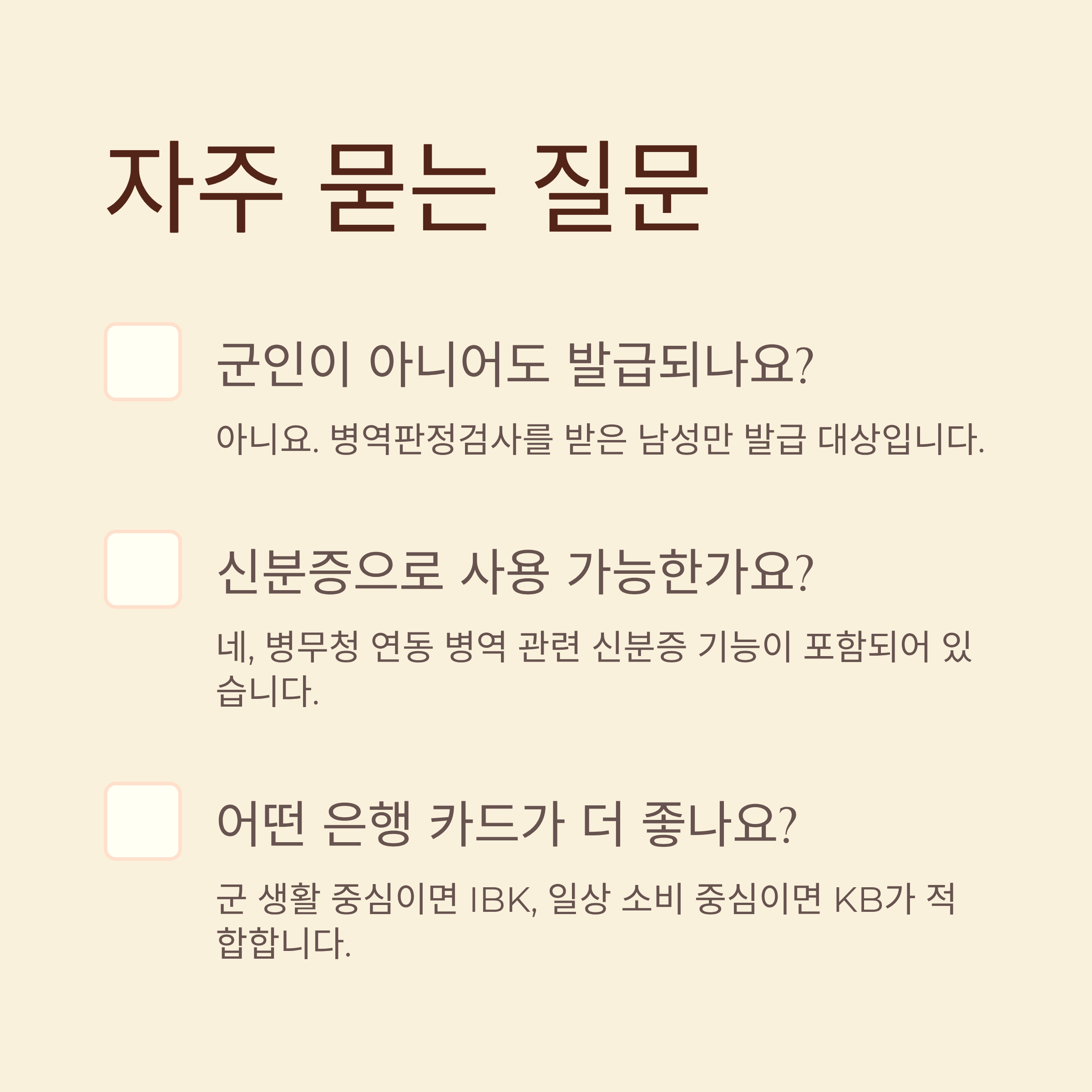 | 적합 대상 | 복무 중 부대 중심 소비자 | 외부 소비 많거나 전역 후 활용자 |