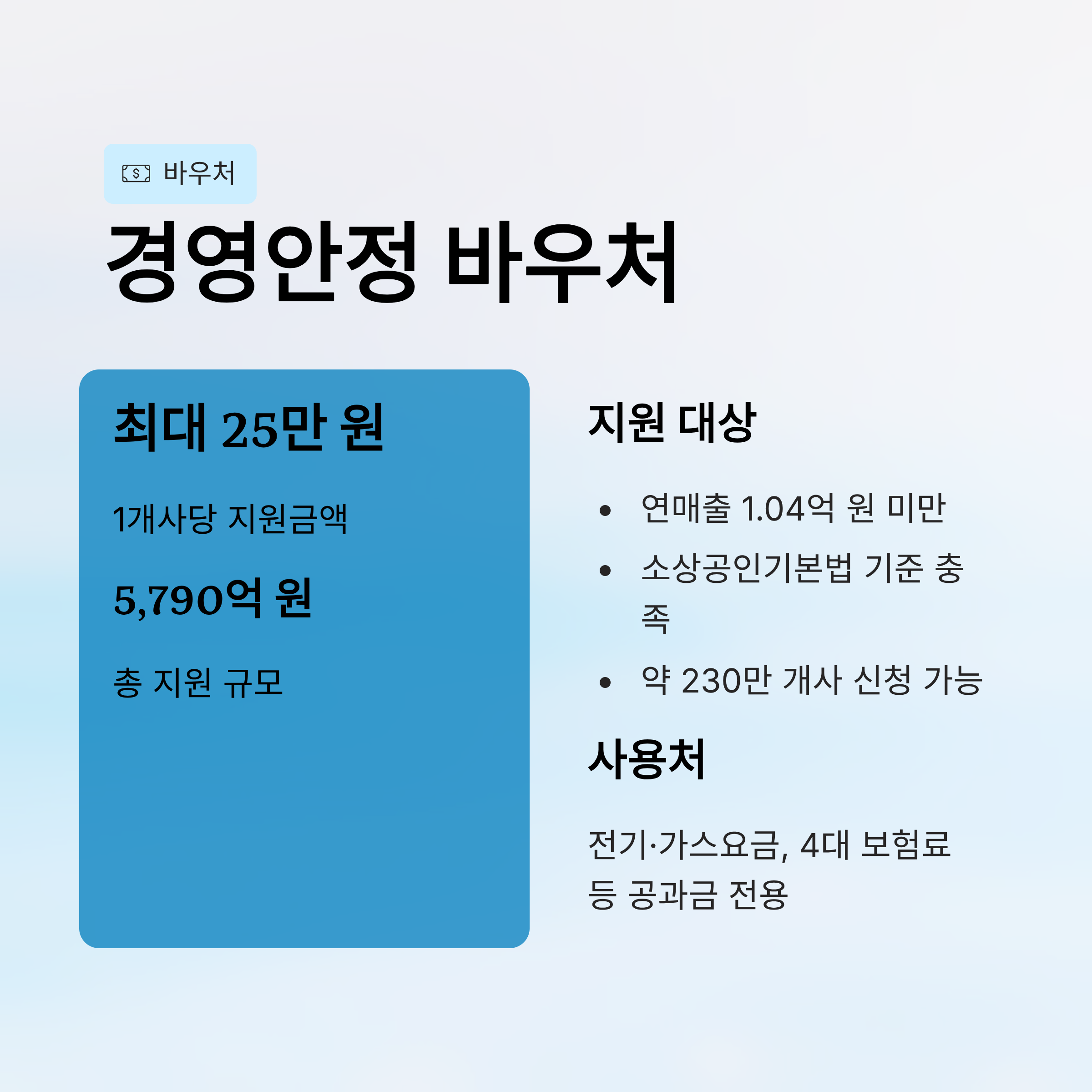 | 경영안정 바우처 | 25만 원/1개사 | 연매출 1.04억 미만 | 온라인 바우처 신청 | 전기·가스요금, 4대보험료 등 |