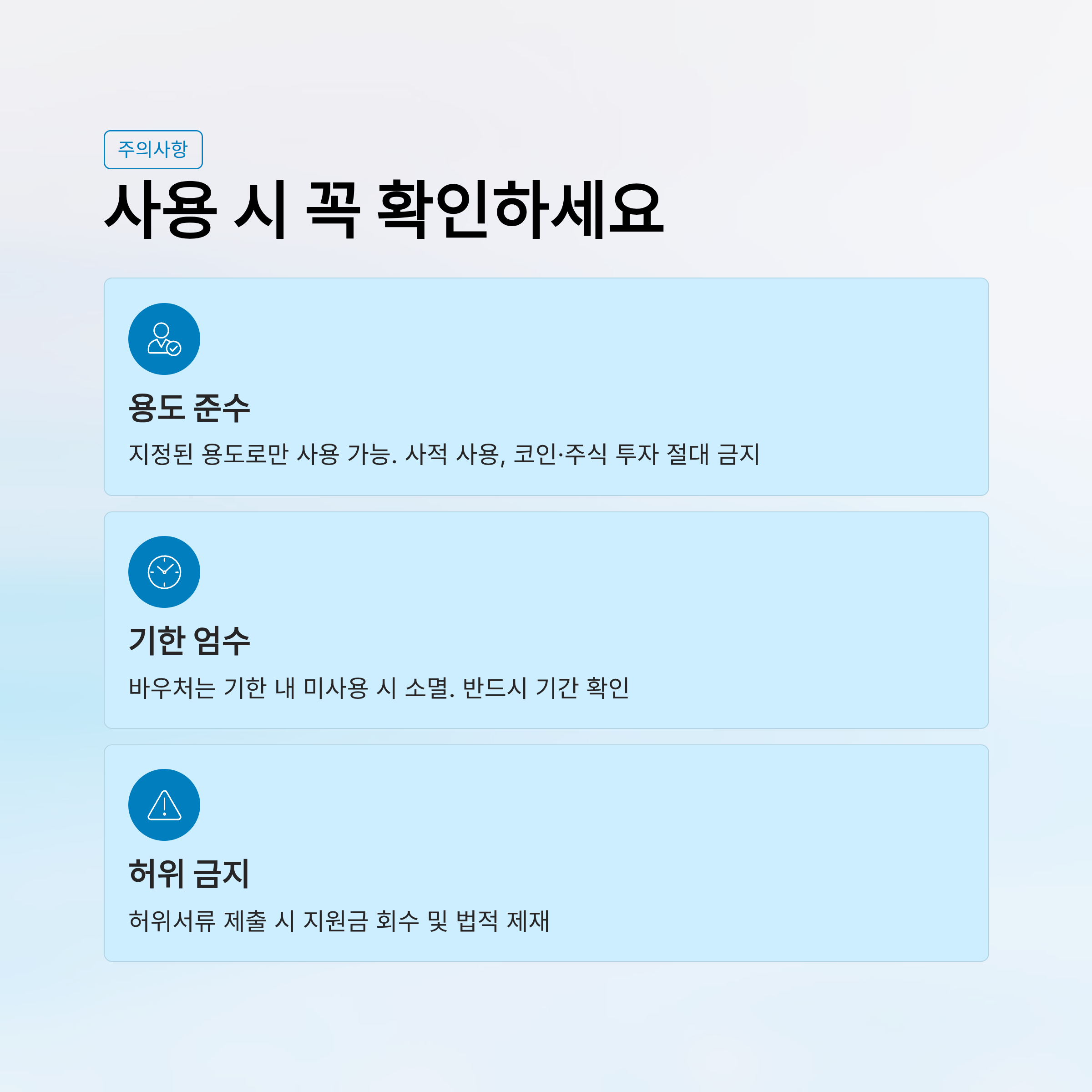 | 정책자금 | 임대료, 재료비, 마케팅비, 설비 교체 등 | 사적 사용, 코인·주식 투자 등 금지 |