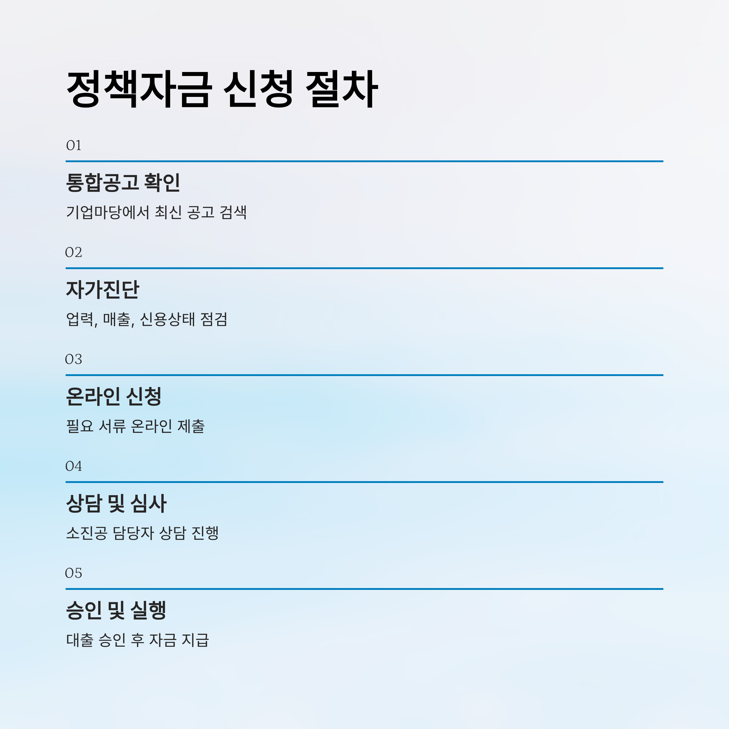 - 자가진단: 업력, 매출, 신용 상태 등 점검