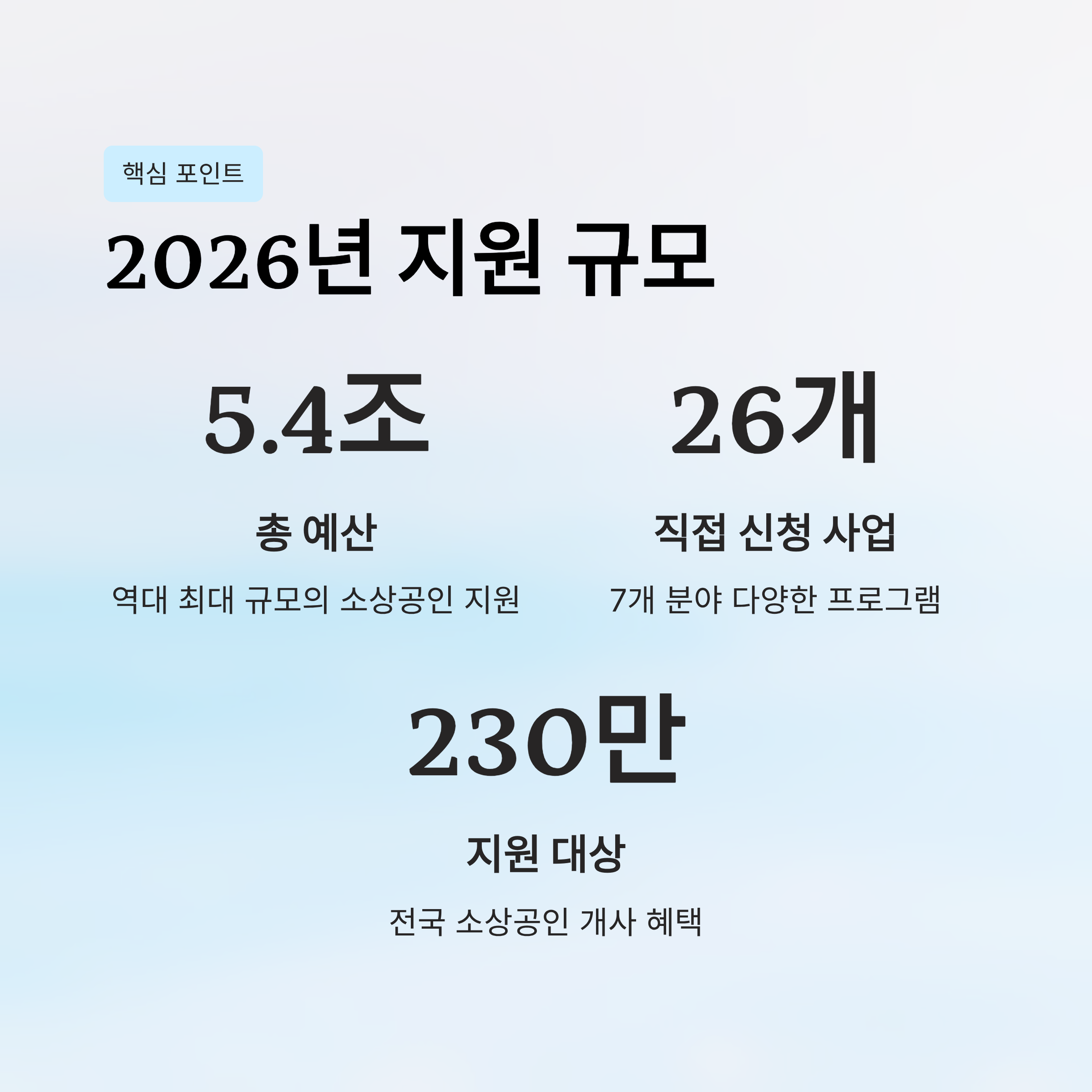 2026년, 중소벤처기업부의 소상공인 지원 정책이 역대 최대 규모로 확대됩니다. 총 5.4조 원이라는 대규모 예산이 투입되며, 현금성 지원부터 저리 융자, 디지털 전환까지 다양한 프로그램이 준비되어 있습니다. 지금 바로 어떤 지원이 있는지, 누가 받을 수 있는지 확인해보세요.